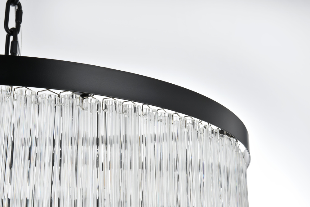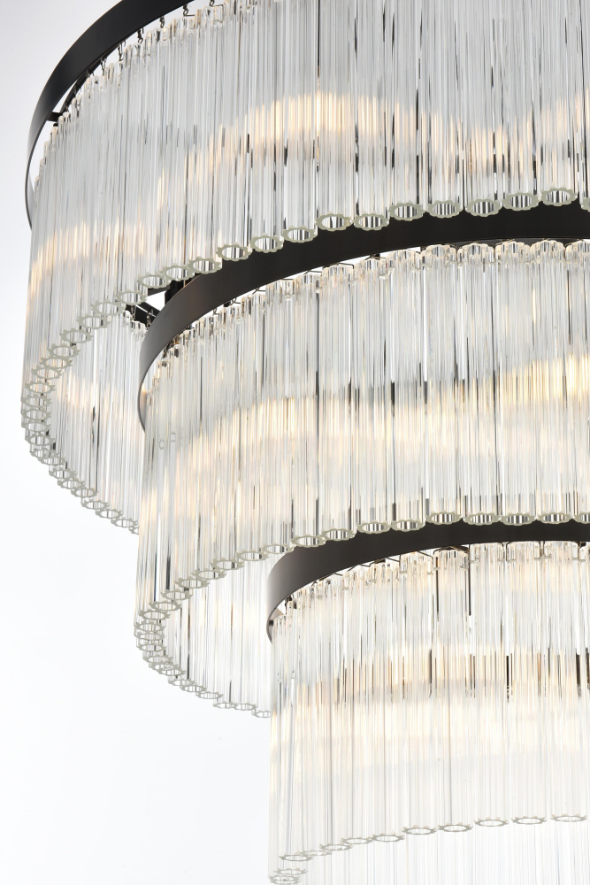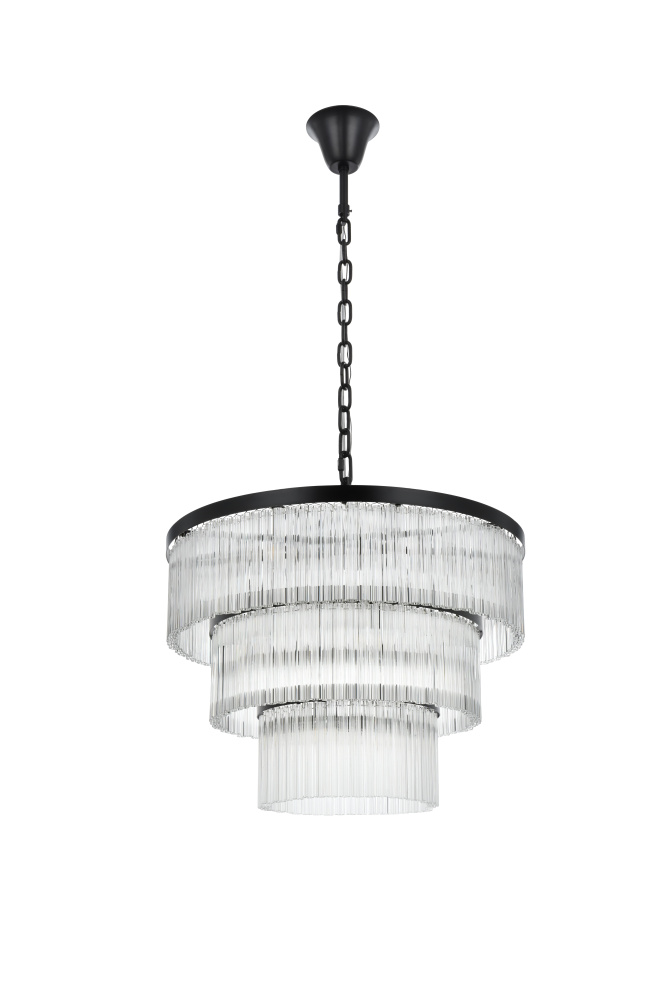 Turn your space into a glowing masterpiece with this striking pendant light, crafted from durable iron and shimmering clear ribbed glass. The cascading layers create a stunning interplay of light and shadow, refracting illumination into a radiant display that transforms your space into an illuminated work of art. Available in chrome for a sleek, contemporary aesthetic, black for bold contrast, and satin gold for an inviting warmth, this pendant light is as versatile as it is beautiful. Whether you choose a single tier for minimalist charm, two tiers for balanced depth, three tiers for bold presence, or four tiers for show-stopping grandeur, there’s an option for every setting. Featuring both round and rectangular frame designs, this fixture adapts to any space with ease. Complete with a matching canopy and chain, and fully dimmable for customized lighting, this pendant pairs perfectly with the coordinating single-tier flush mount and wall sconce collection, ensuring a cohesive, radiant design throughout youhome or office. Please note: light bulbs are sold separately.
