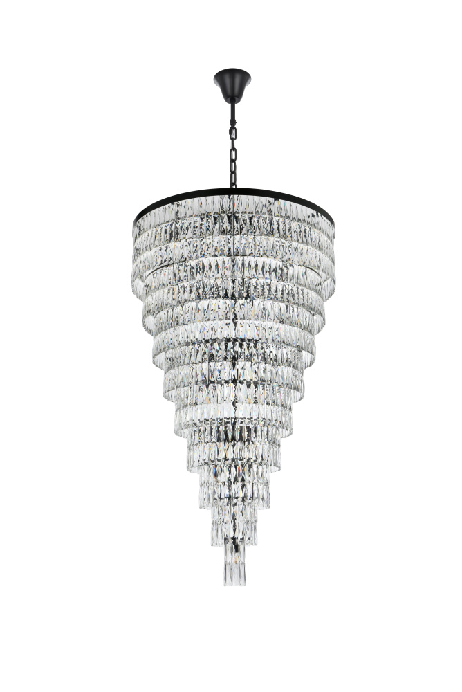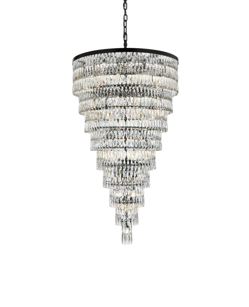 Transform your space with this extraordinary pendant that reimagines classical crystal design for contemporary interiors. The masterfully engineered silhouette features nine graduating tiers that create a spectacular inverted pyramid, reminiscent of a frozen cascade captured in mid-descent. Each precisely cut rectangular crystal is strategically positioned to maximize light play, creating mesmerizing displays of fractured light throughout your space. The substantial scale makes this fixture an ideal centerpiece for grand entryways, sophisticated dining rooms, or executive offices. The thoughtful construction incorporates 61 light sources distributed throughout the tiers, ensuring both spectacular illumination and enchanting crystal animation. The robust iron framework provides a secure foundation while maintaining visual lightness, allowing the crystals to appear as if floating in space. Available in reflective chrome, sophisticated black, or warm satin gold, this pendant makes an unforgettable statement while maintaining refined restraint. The cascading arrangement creates a sense of movement and flow, while the geometric precision of each crystal adds contemporary edge to the classical form. This is more than a light fixture – it's an architectural feature that transforms your space through its commanding presence and spectacular light performanc