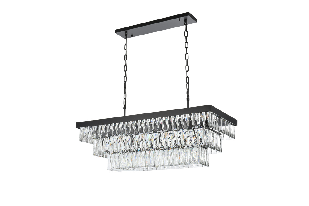 Transform your space with this spectacular linear pendant that reinvents crystal lighting for contemporary interiors. The bold rectangular frame suspends two perfectly proportioned crystal tiers, creating a mesmerizing interplay of light and structure. Each precisely cut crystal is strategically positioned to maximize light play, producing brilliant refractions that dance across your space. The strong horizontal presence makes this fixture an ideal centerpiece above dining tables, conference rooms, or in grand living spaces. The thoughtful construction marries industrial strength with crystalline delicacy, as the robust metal frame appears to float above while supporting the spectacular crystal arrangement. Whether styled in reflective chrome, sophisticated black, or warm satin gold, this pendant commands attention through its architectural presence. The linear composition offers a fresh interpretation of crystal lighting, where clean lines and geometric precision meet the spectacular light performance of premium crystal. This fixture doesn't merely illuminate – it defines space through its commanding horizontal presence while creating an ever-changing display of light and shado