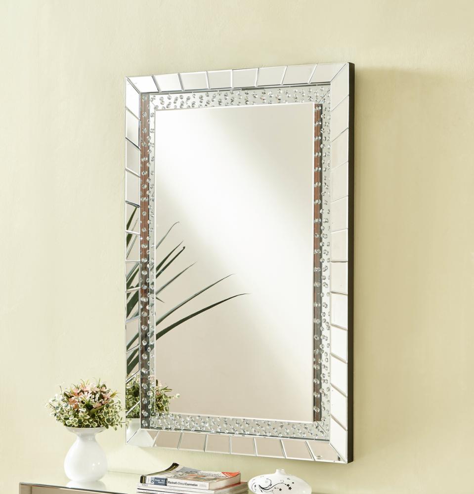 The Sparkle collection has crystal gems all over inside, crystals and silver mirror reflect shine. It combine both the function and decoration to set your house. Make a striking statement in your home or office with this stunning contempo style clear mirror. Featuring dozens of expertly cut, beveled edge mirror pieces, layered together to create a bold, yet elegant textured look, you can adorn any promintnt wall with this dazzling contemporary mirror and be sure to catch people’s attention. Contempo rectangular sunburst style clear mirror · Mirrors and all surrounding panels are made with beveled edges