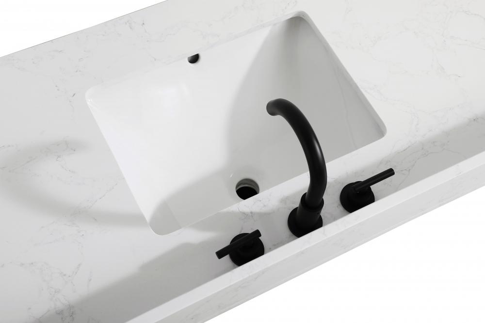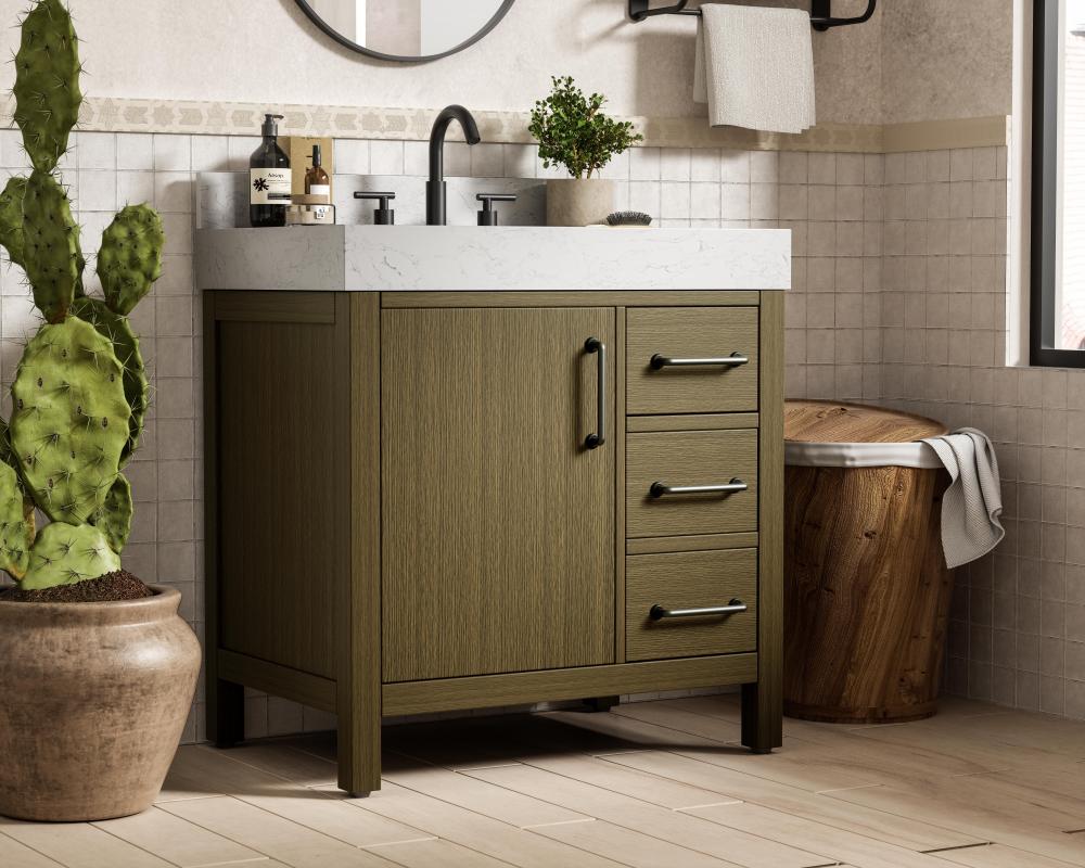 The engineered marble countertop stands out with its bold 4-inch thickness and natural veining, creating a commanding presence in any bathroom.