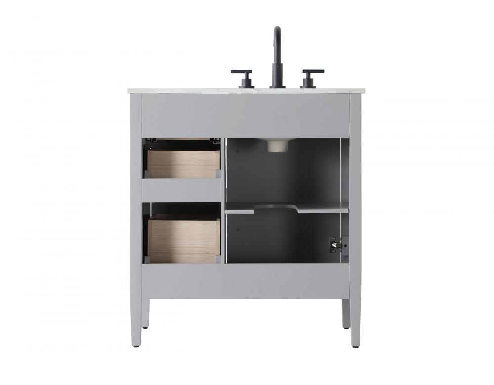 The vanity is topped with a stunning white engineered marble countertop with natural veining that adds luxurious detail and durability.