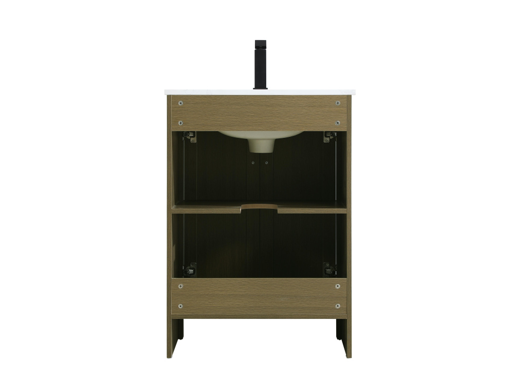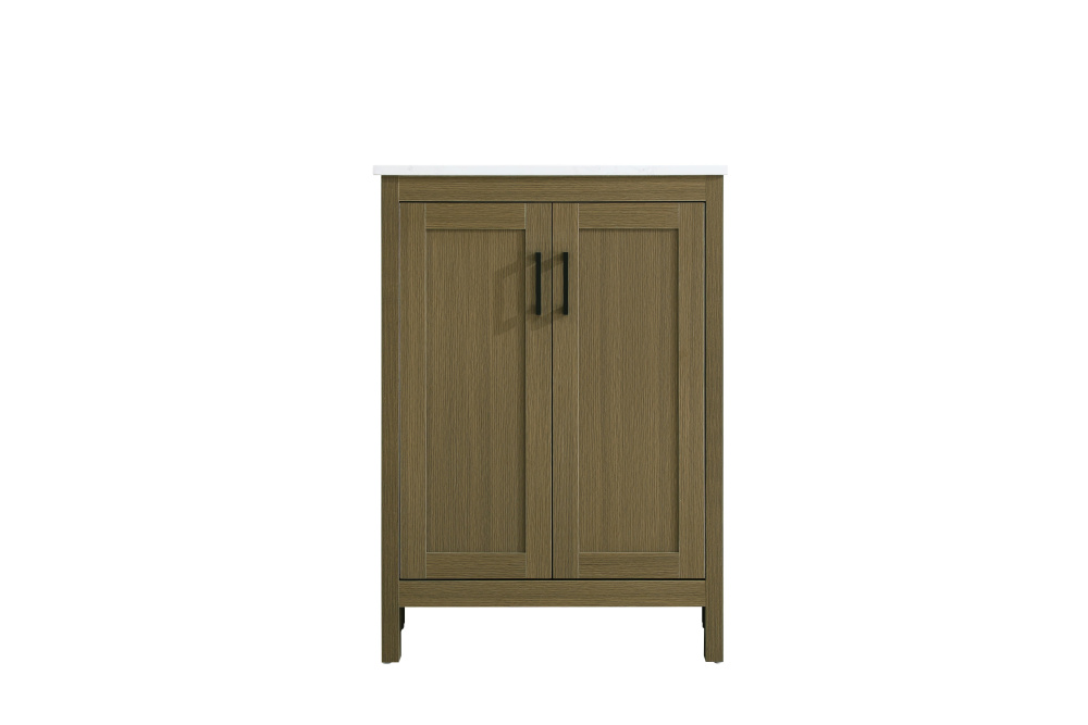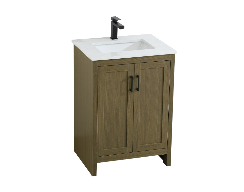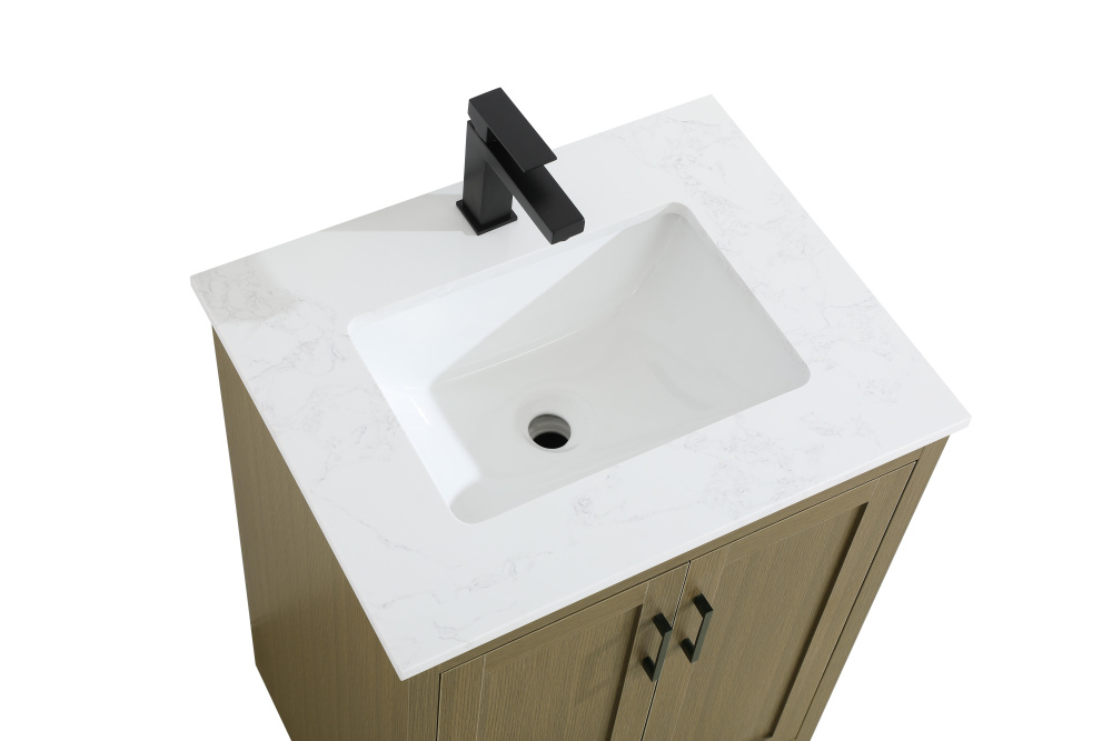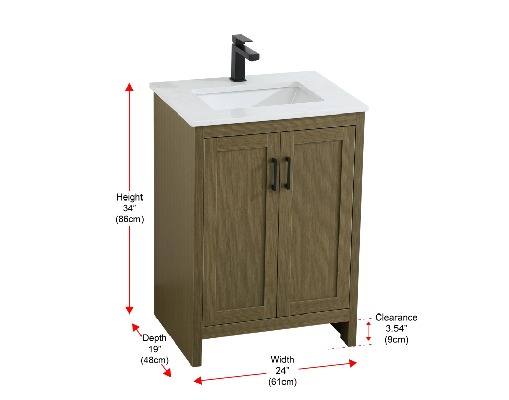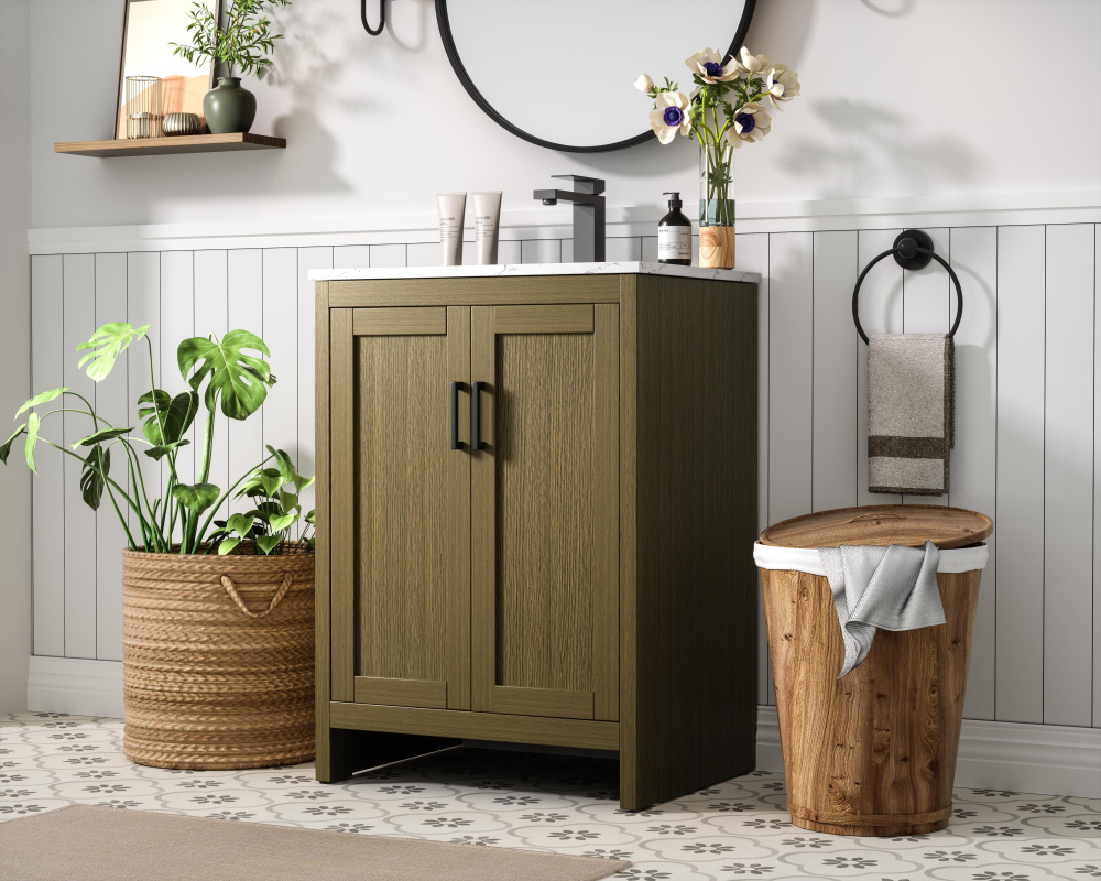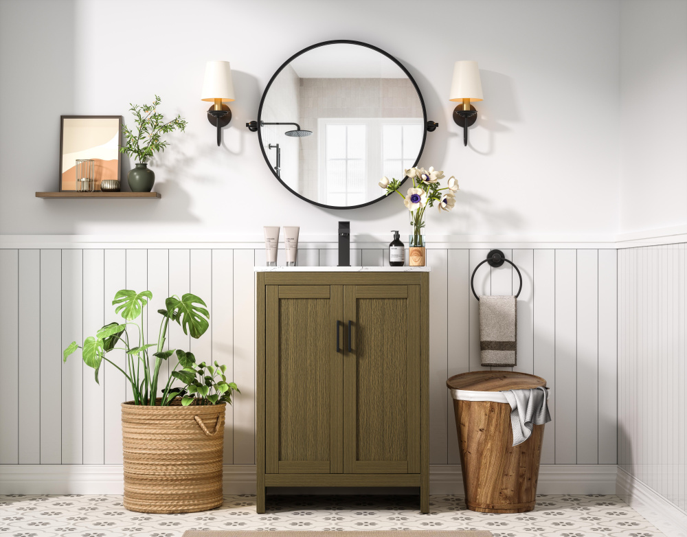 Redefine your bathroom with this transitional shaker-style vanity, designed to combine practicality with timeless aesthetics. Its clean lines and shaker-style door panels create a versatile look that complements both traditional and contemporary spaces. The engineered marble countertop, featuring a unique faux marbled pattern, adds a sophisticated focal point, while the integrated porcelain sink ensures durability and easy maintenance. The vanity includes a shelf with a smart U-shaped cutout, optimizing storage while accommodating plumbing. Crafted from sturdy MDF with a warm woodgrain finish, it brings a natural and inviting feel to your bathroom. Equipped with adjustable foot levelers for stability and a pre-drilled faucet hole for quick installation, this compact vanity delivers on both style and function. Best of all, it arrives fully assembled, ready to enhance your space right out of the box.