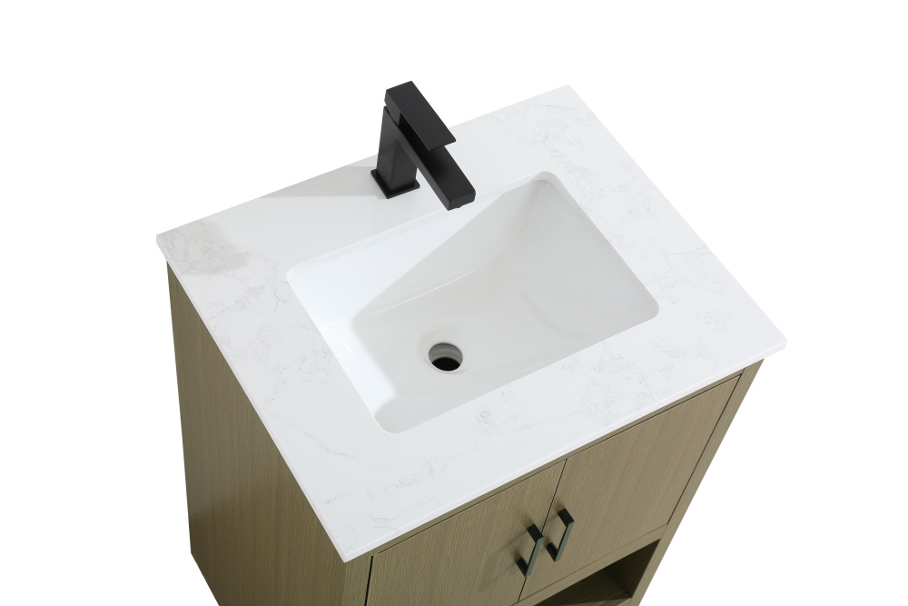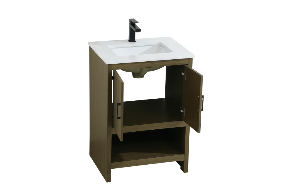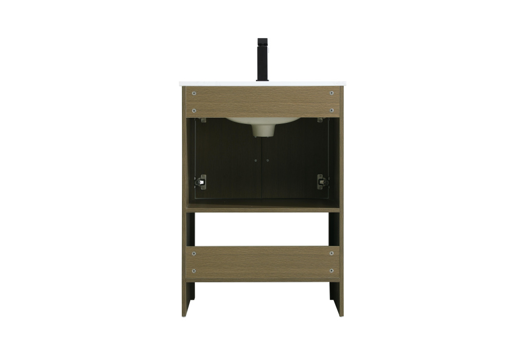 Bring modern style and practicality to your bathroom with this sleek vanity, designed to complement contemporary spaces. The flat-panel doors create a clean, minimalist look, while the open bottom shelf provides functional storage or a space to display decorative items. The engineered marble countertop showcases unique faux marbling, adding a refined and distinct touch to the design. The durable porcelain sink is easy to maintain, and the single pre-drilled faucet hole simplifies the installation process. Constructed from high-quality MDF with a versatile woodgrain finish, this vanity combines durability with timeless style. With adjustable foot levelers for stability on uneven floors and a fully assembled design, this piece offers a seamless addition to your bathroom.