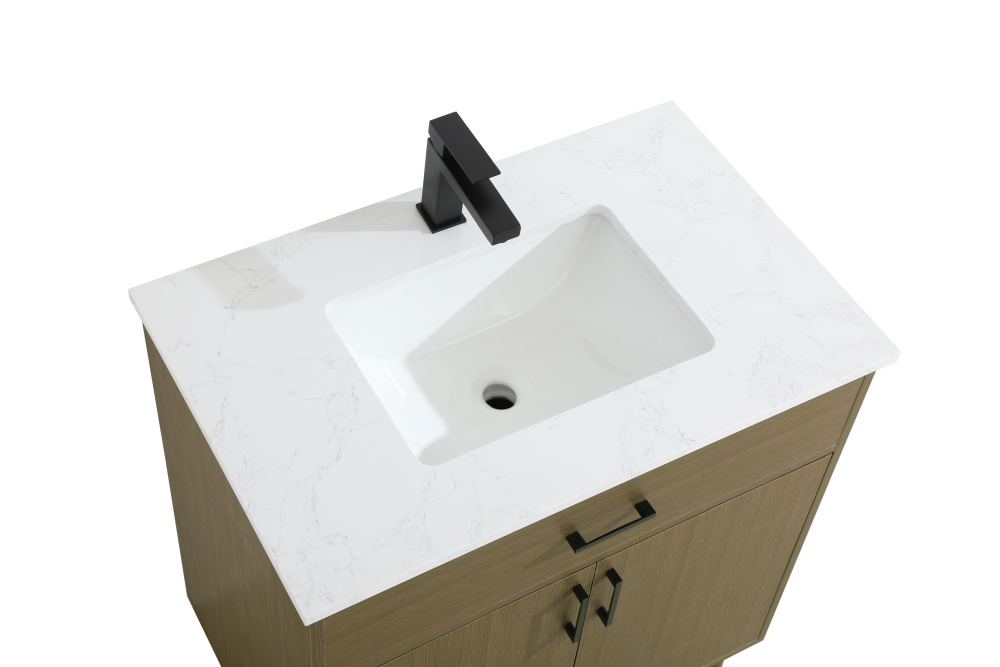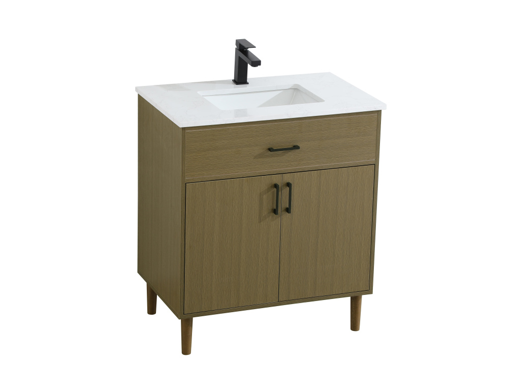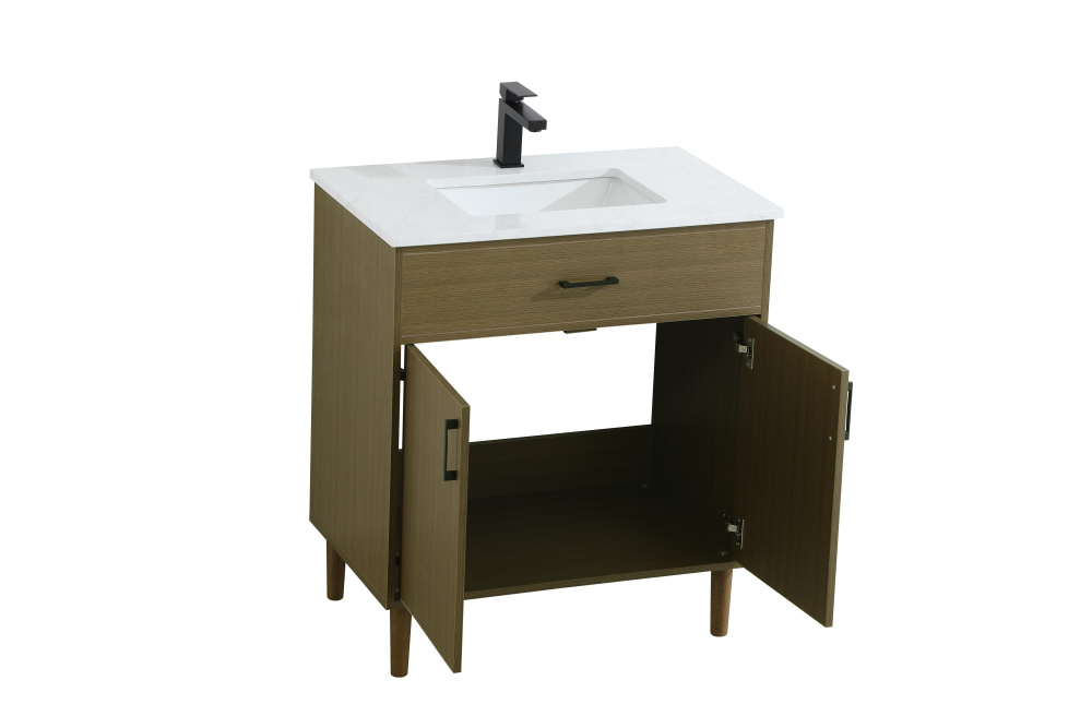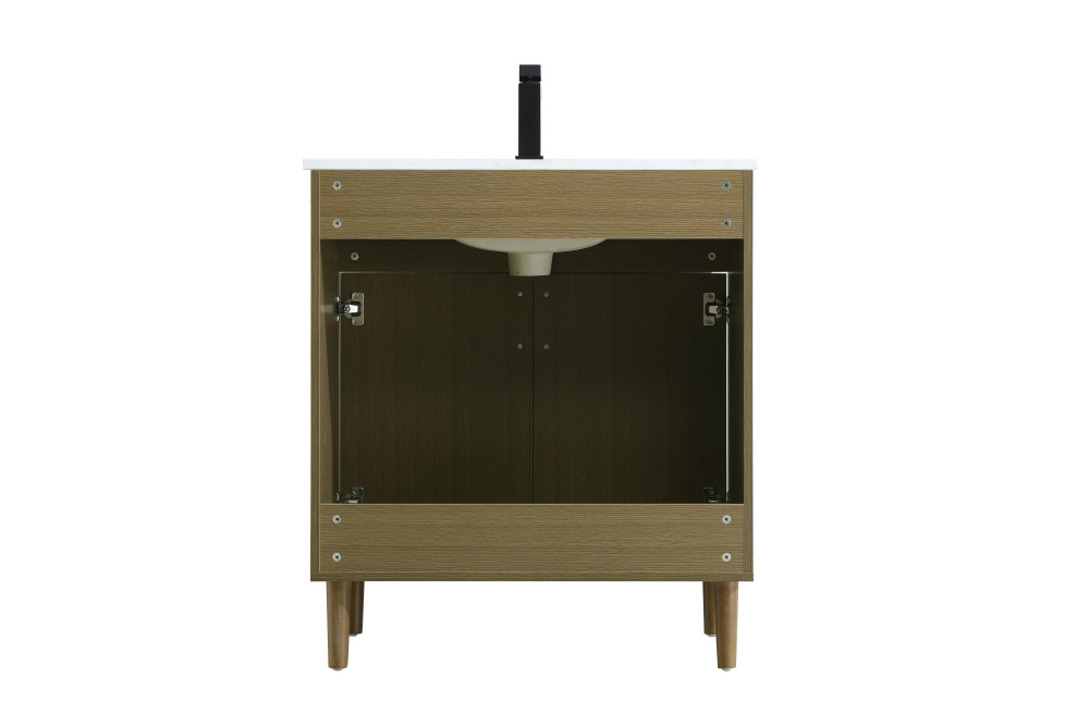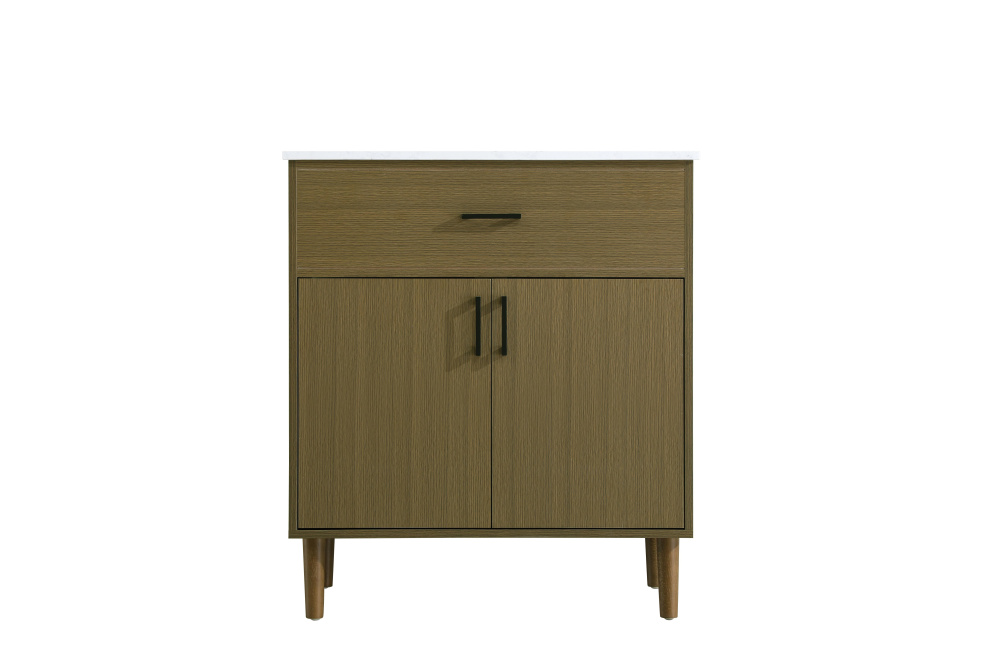 Transform your bathroom with this mid-century modern vanity, designed to bring both functionality and a sense of style to your space. Its clean lines, minimalist design, and tapered solid wood legs evoke a timeless charm, perfect for blending with modern and transitional interiors. The engineered marble countertop, with its unique faux marble veining, adds a refined, luxurious touch, while the porcelain sink is both durable and easy to maintain. Practicality meets aesthetics with a faux drawer for balanced design and a spacious double-door cabinet for efficient storage. Constructed from solid wood and MDF, this vanity offers lasting durability, while adjustable foot levelers ensure stability on any floor. Shipped mostly assembled, the solid wood legs can be effortlessly twisted into place, making installation quick and hassle-free.