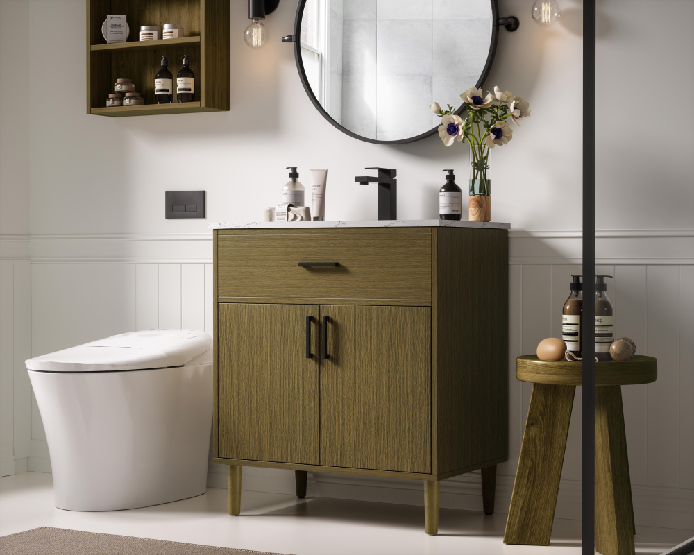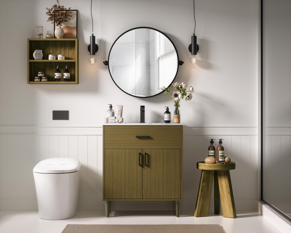 A natural wood-inspired finish adds warmth and texture to your bathroom.
