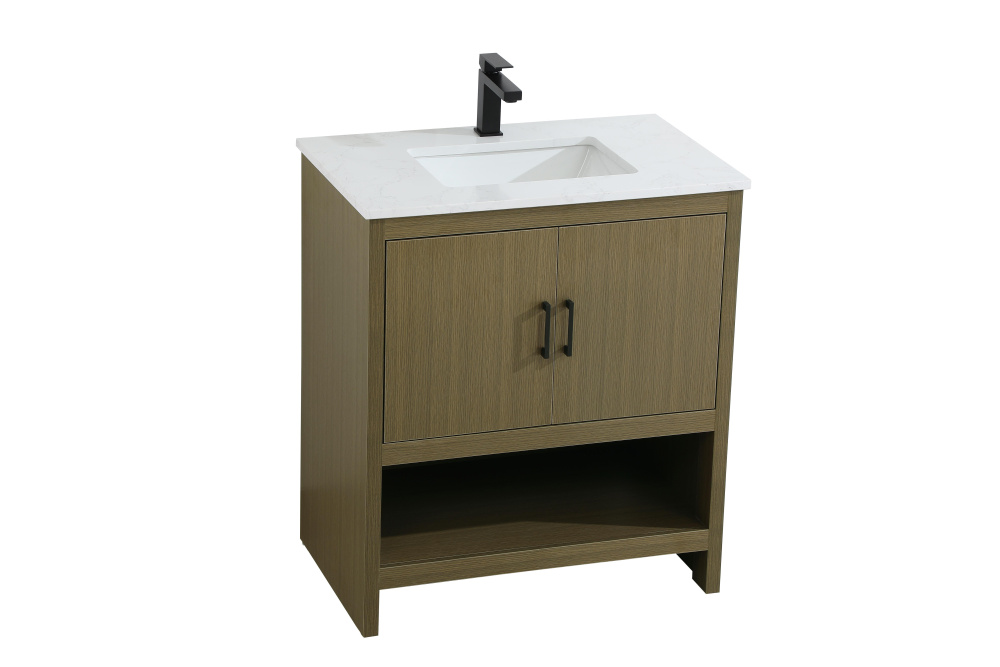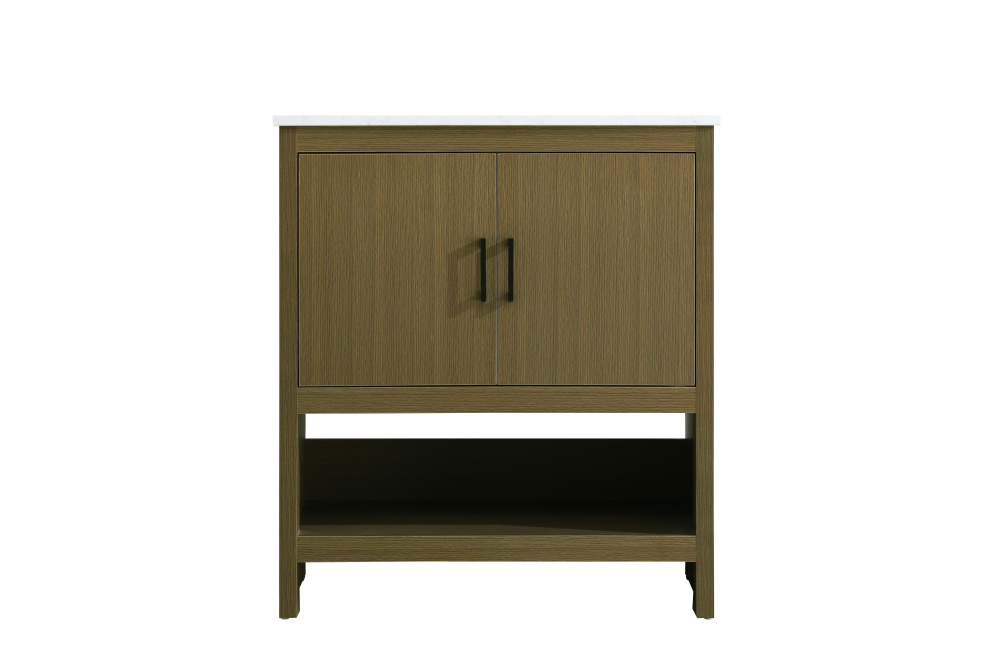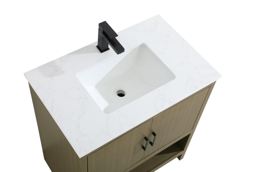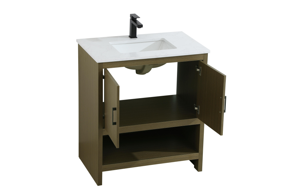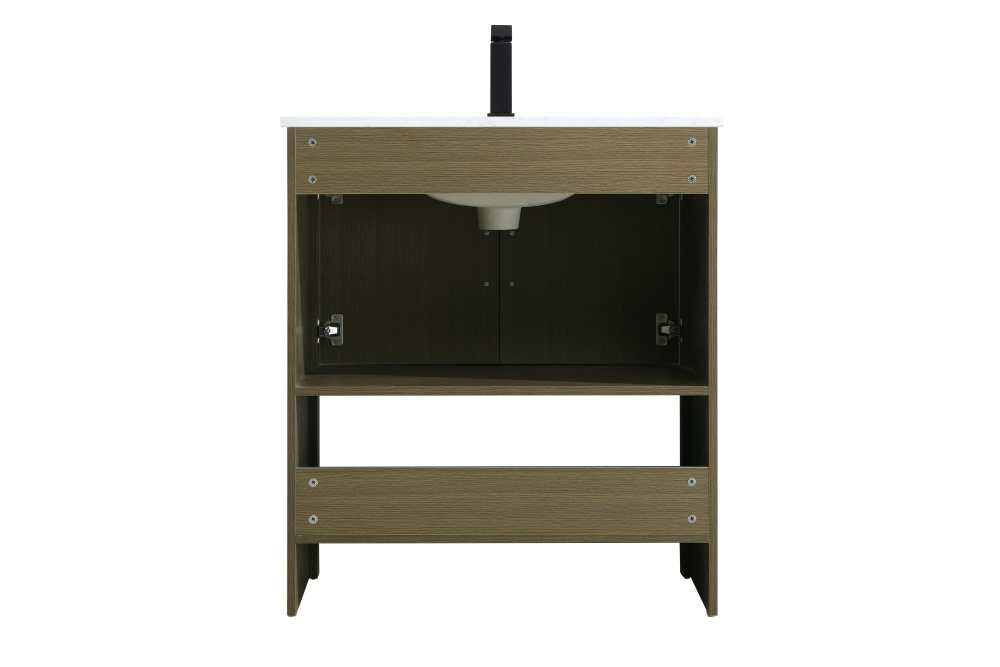Bring modern style and practicality to your bathroom with this sleek vanity, designed to complement contemporary spaces. The flat-panel doors create a clean, minimalist look, while the open bottom shelf provides functional storage or a space to display decorative items. The engineered marble countertop showcases unique faux marbling, adding a refined and distinct touch to the design. The durable porcelain sink is easy to maintain, and the single pre-drilled faucet hole simplifies the installation process. Constructed from high-quality MDF with a versatile woodgrain finish, this vanity combines durability with timeless style. With adjustable foot levelers for stability on uneven floors and a fully assembled design, this piece offers a seamless addition to your bathroom.