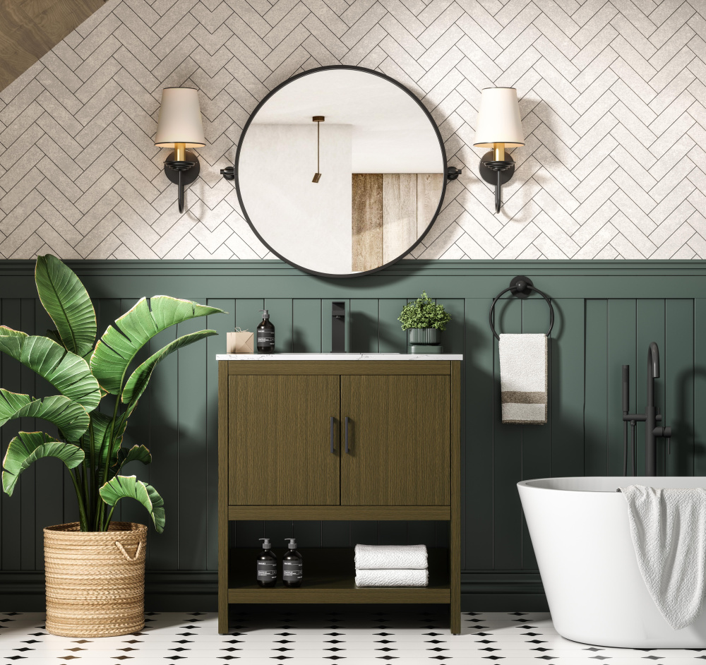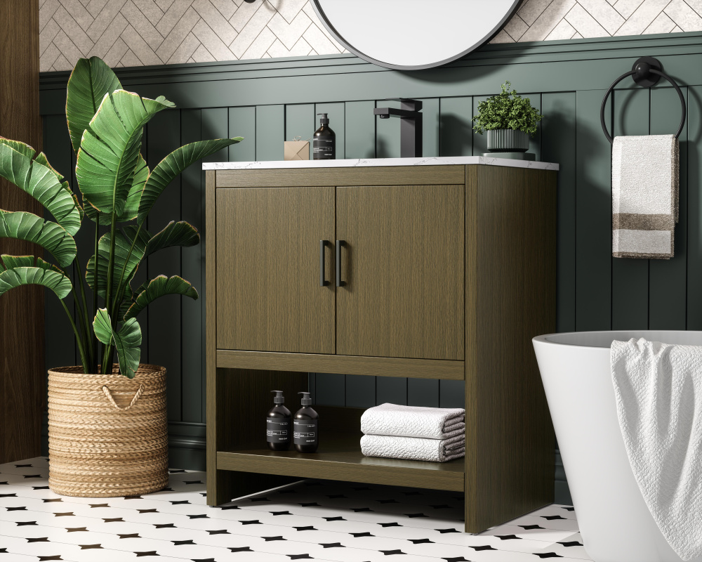 A natural wood-inspired finish adds warmth and texture to your bathroom.