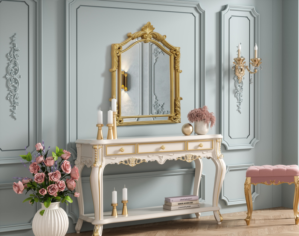 With its ornate crest and intricate corner embellishments, this mirror transforms any space into a masterpiece of classic décor