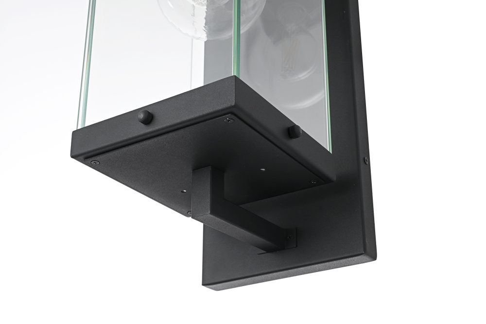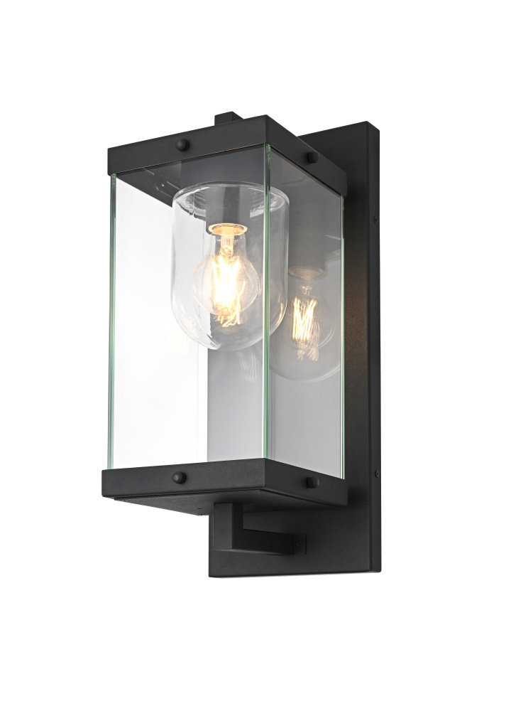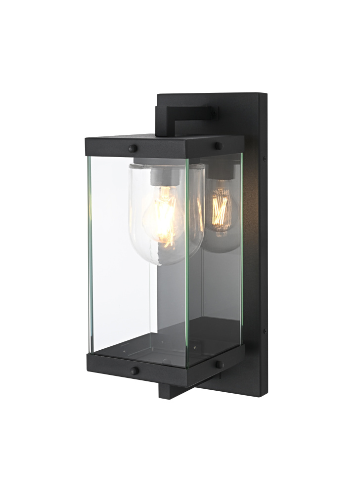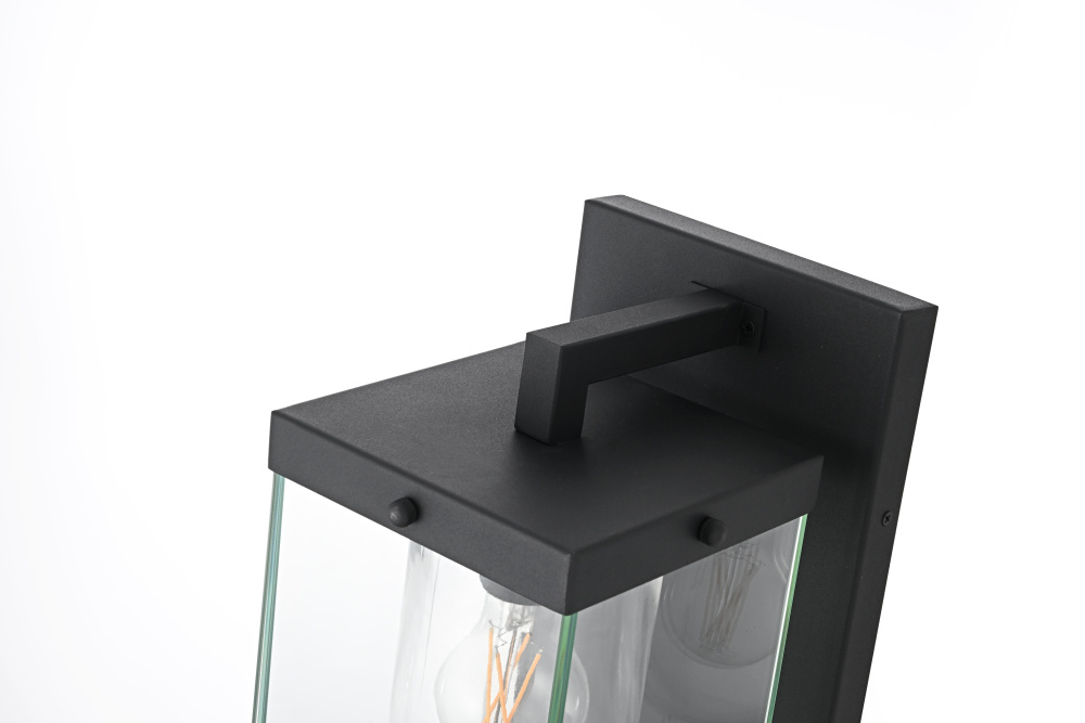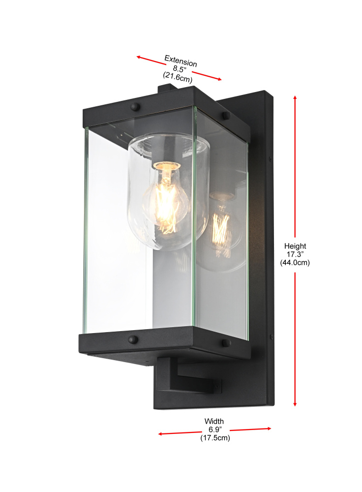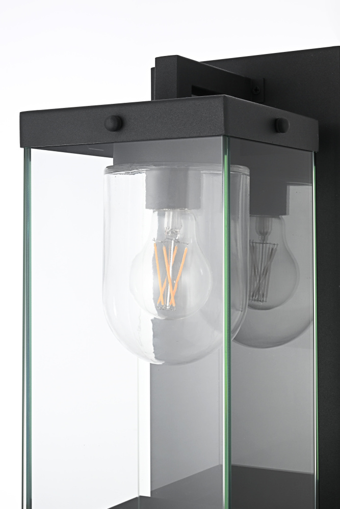 Create a sophisticated and welcoming outdoor ambiance with this sleek, modern lantern-style wall light. The striking rectangular iron frame, finished in a deep matte black, houses a unique dual-glass design—featuring a clear cylindrical shade within a larger glass enclosure for a layered and dimensional look. This design not only enhances the light’s depth but also showcases the beauty of an exposed filament bulb (not included). A floating arm detail adds an elegant architectural element, while the enclosed bottom, secured with screws, ensures durability against the elements. Perfect for patios, entryways, and exterior walls, this wet-rated lantern is designed for long-lasting style and performance. Pair it with your preferred E26 bulb to create a warm and inviting glow that enhances your outdoor space with refined sophisticat