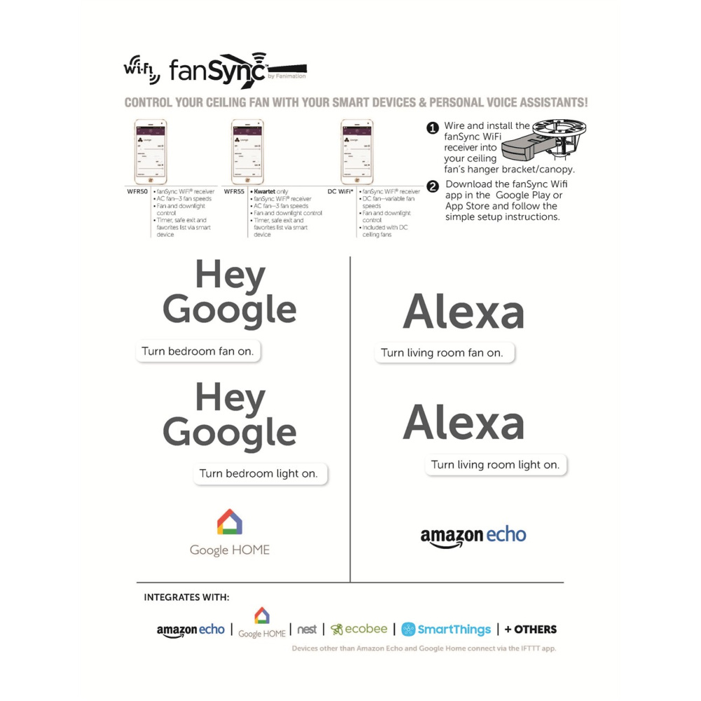 TECHNOLOGY: Correlated Color Temperature (CCT) Select Technology, provides a selection of light colors ranging from warm white, bright light or daylight and WiFi fanSync, which provides fan control with a smart device or voice assistant