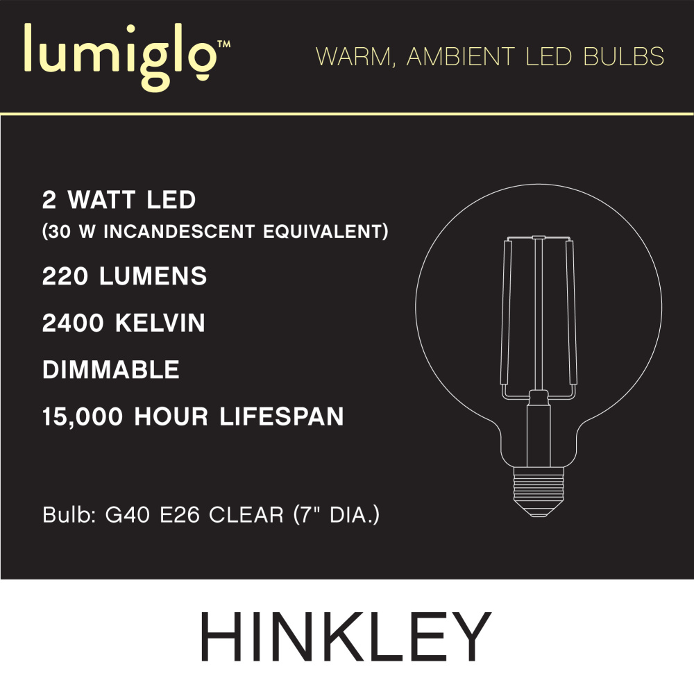 To create superior, softer light that sets the scene in any indoor or outdoor setting, Hinkley’s Lumiglo™ LED bulbs feature unique filament technology designed to cast a warm ambient glow. Dimmable functionality provides full control over brightness, allowing you to craft an atmosphere that perfectly accentuates your space.