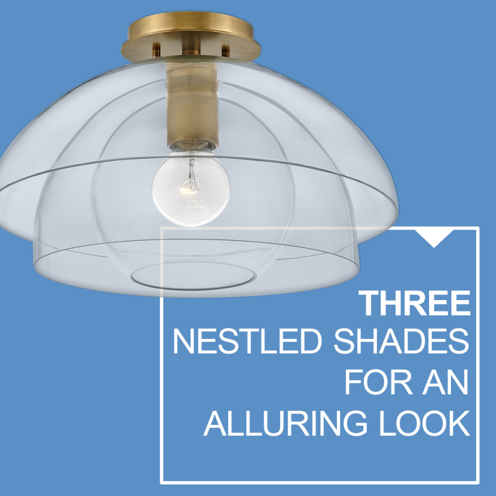 Lotus reveals itself in layers of three concentric clear glass shades nested together in a unique and alluring shape. A true shapeshifter, Lotus can be installed as a pendant or close to the ceiling. Available in either Heritage Brass or Black finish options, this transitional design grows even more glamorous when illuminated.