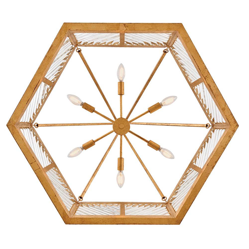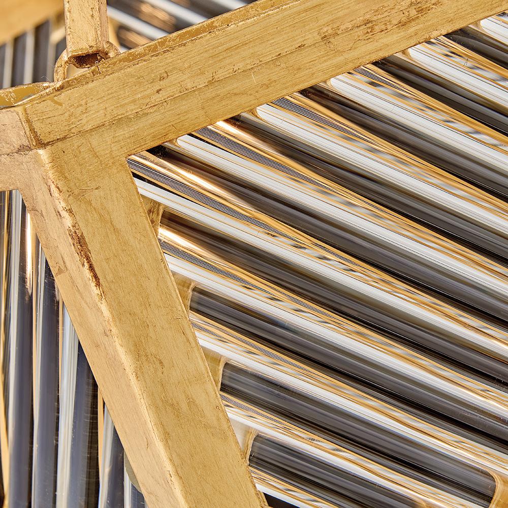 A reimagining of vintage designs from the 40s and 50s, Sura’s transitional, hexagonal Distressed Brass frame creates a glamorous yet understated and tailored appeal. Cylindrical glass rods set at alternating angles echo a soft herringbone pattern, juxtaposing geometry within geometry. Layered details create a reeded effect that is reflective and alluring.
