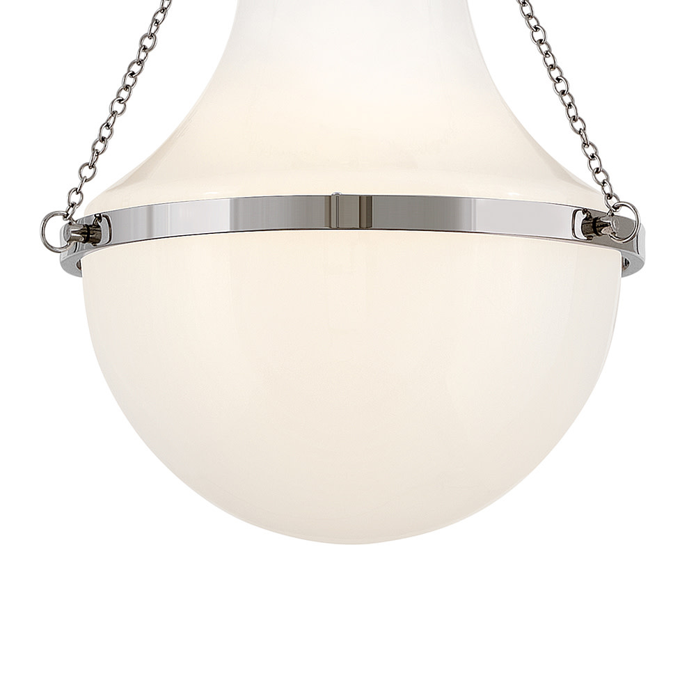 Fusing a sculpted, modern form with classically styled details, Collins features a transitional teardrop shade crafted from blown, cased opal glass. A central metal band and delicate chain uprights are available in Heritage Brass or Black Oxide finishes.
