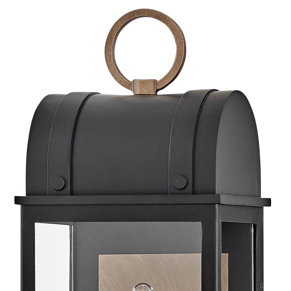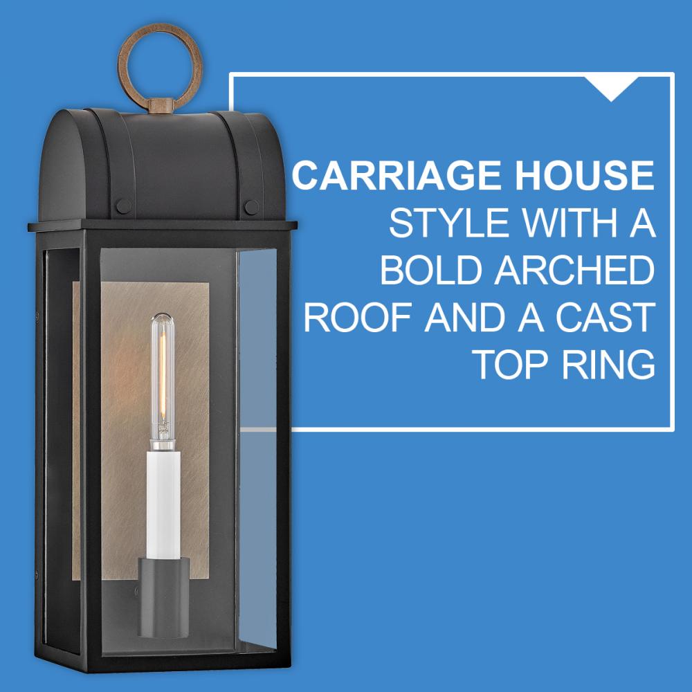 Inspired by traditional colonial lanterns, Campbell’s carriage house styling complements classic architecture accentuated by a bold arched roof and a cast top ring. Candelabra lamps with contrasting warm white candle sleeves are enhanced by a Black with Burnished Bronze finish and a reflective backplate.