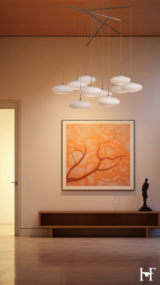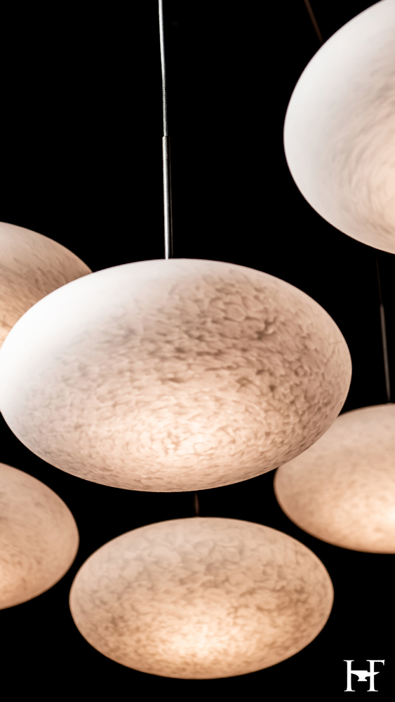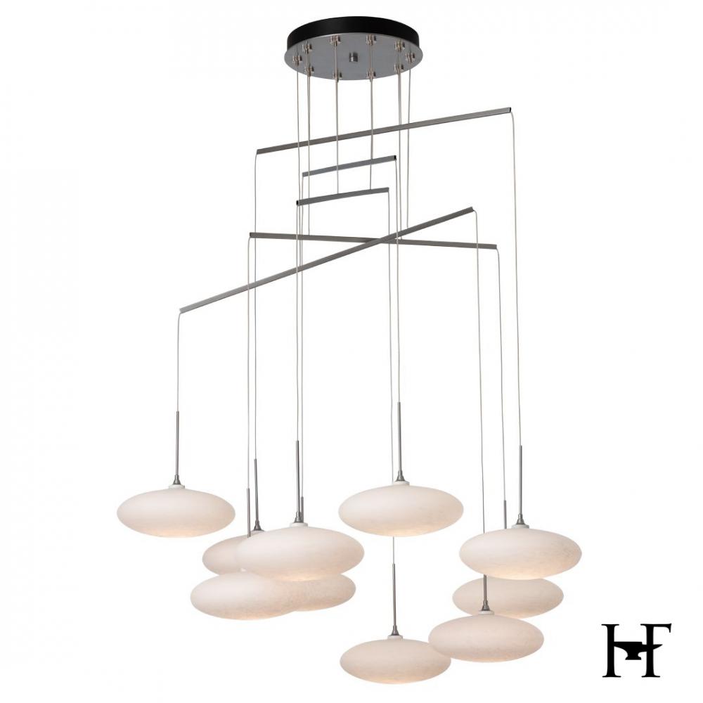 Beautiful white tortoise shell-like glass is shaped in a squashed sphere in this unexpected design resembling a cluster of clouds. Each piece of glass is cable-hung via a mobile created with delicate metal tubes allowing for a highly-adjustable design. The canopy is minimized while the breadth is expanded in an artful display of light.