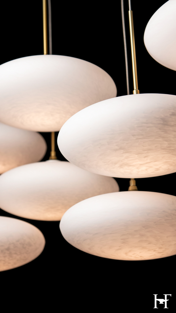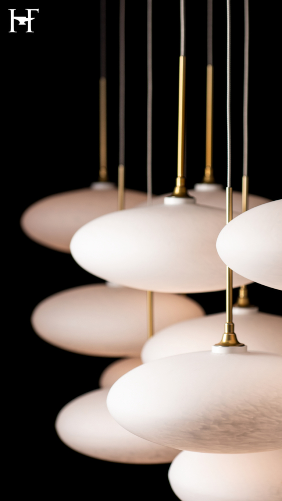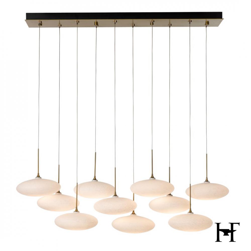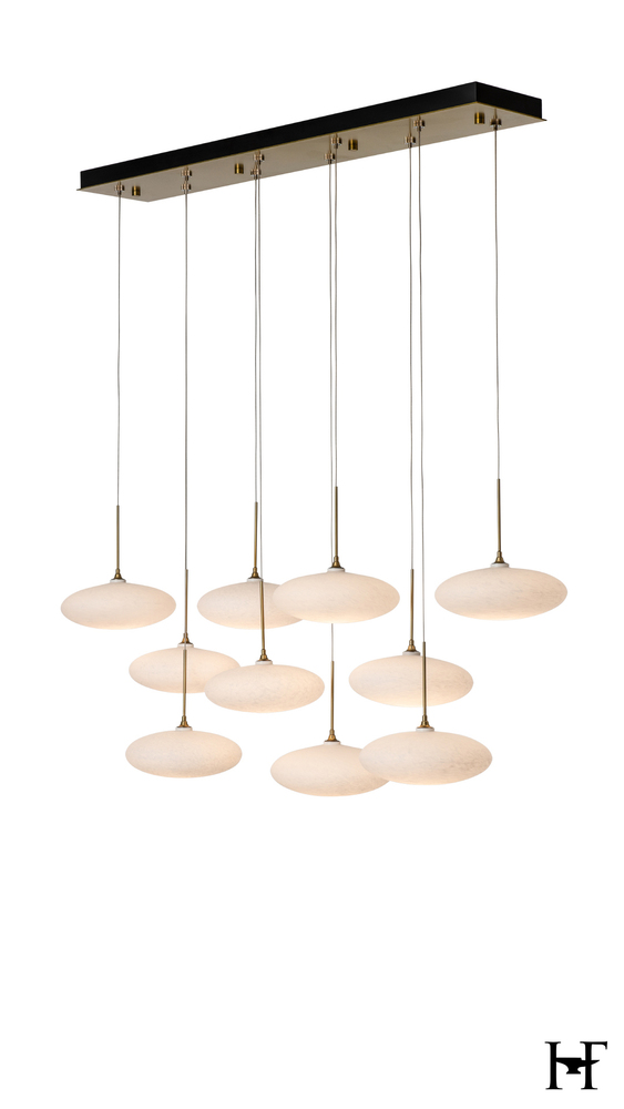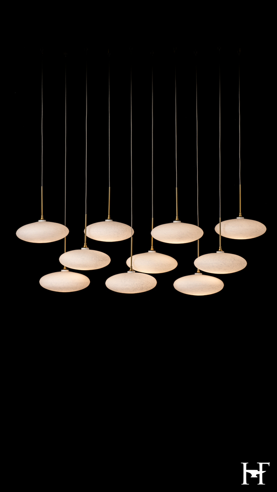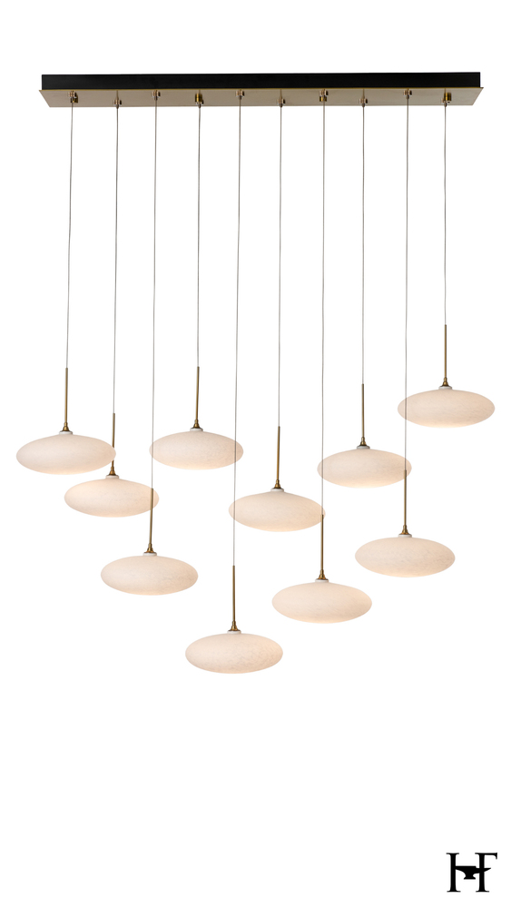 Inspired by nature, 10 white tortoiseshell-like glass shades give this pendant its name: Clouds. Each individual Cloud pendant can be easily staggered in height to customize your installation. The rectangular canopy allows for cable adjustments with no need to cut them, giving you the opportunity to change pendant heights at any time.