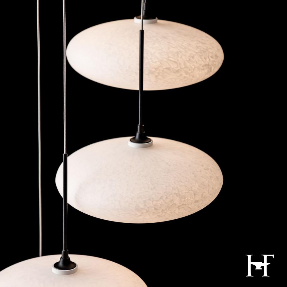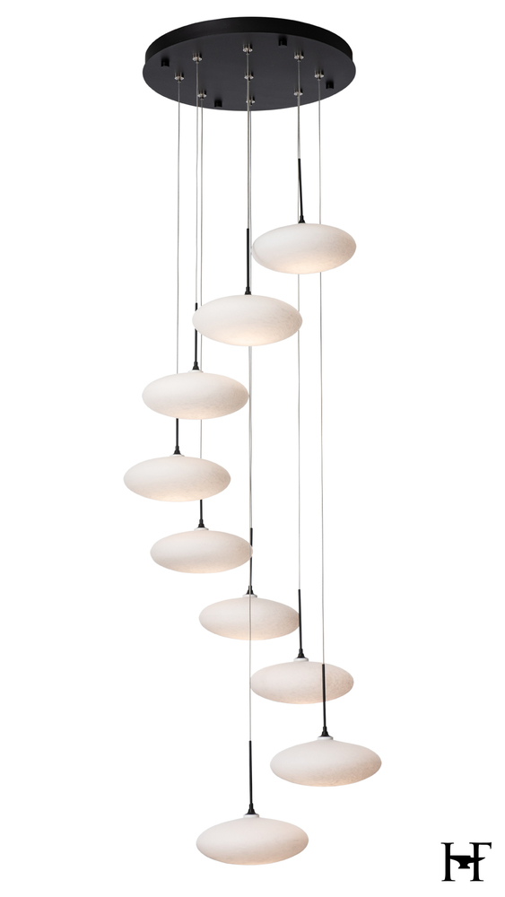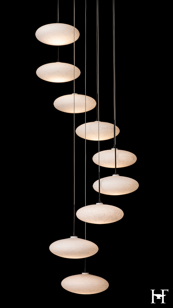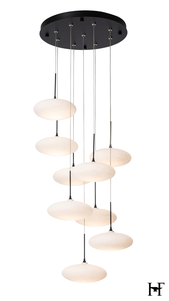 The Clouds 9-Light Pendant features a round canopy from which nine unique white tortoiseshell-like glass shades are in staggered suspension. A focal piece for any space, a billow of puffy Clouds appears to cascade downward from the canopy. Cable lengths are customizable to create the Clouds installation to suit the spatial design.