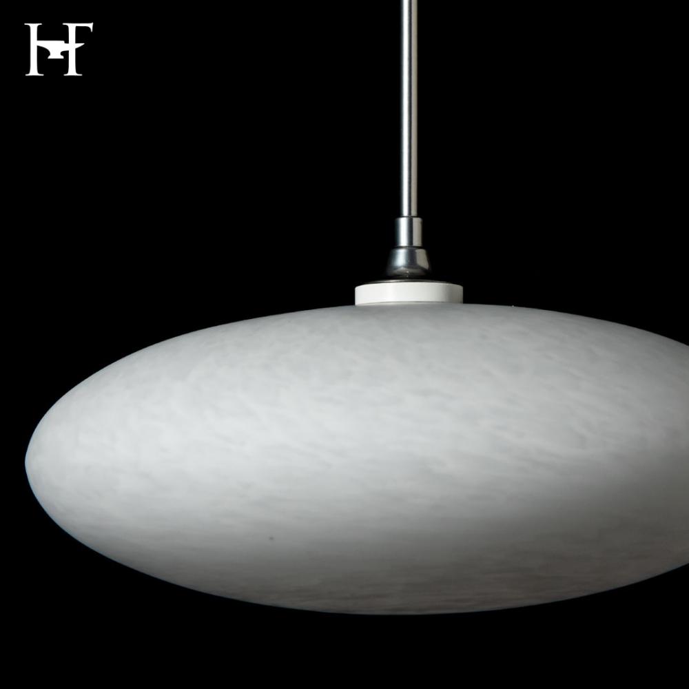 A large squoze sphere that looks to have been pressed on top and bottom to form its unique and delicate shape. Like the puff of a cloud (some also see a UFO) the Cloud is suspended on a low voltage cable. It's white tortoise shell-like glass glows from the light within.