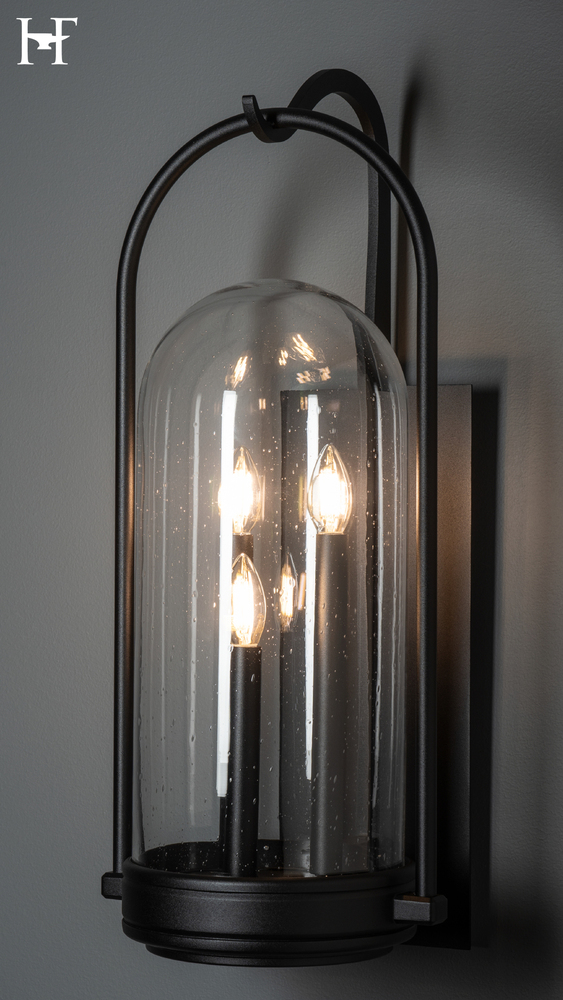 Designer Jason Hancock reinterprets the traditional, hook sconce and delivers the Davis Outdoor Collection. With a large, clear seeded glass dome that encases three "candlesticks" within, this exterior wall mounted sconce makes a statement. Its aluminum backplate, along with the rest of the metalwork is offered in a choice of AAMA 2604-rated Coastal Outdoor Finishes.