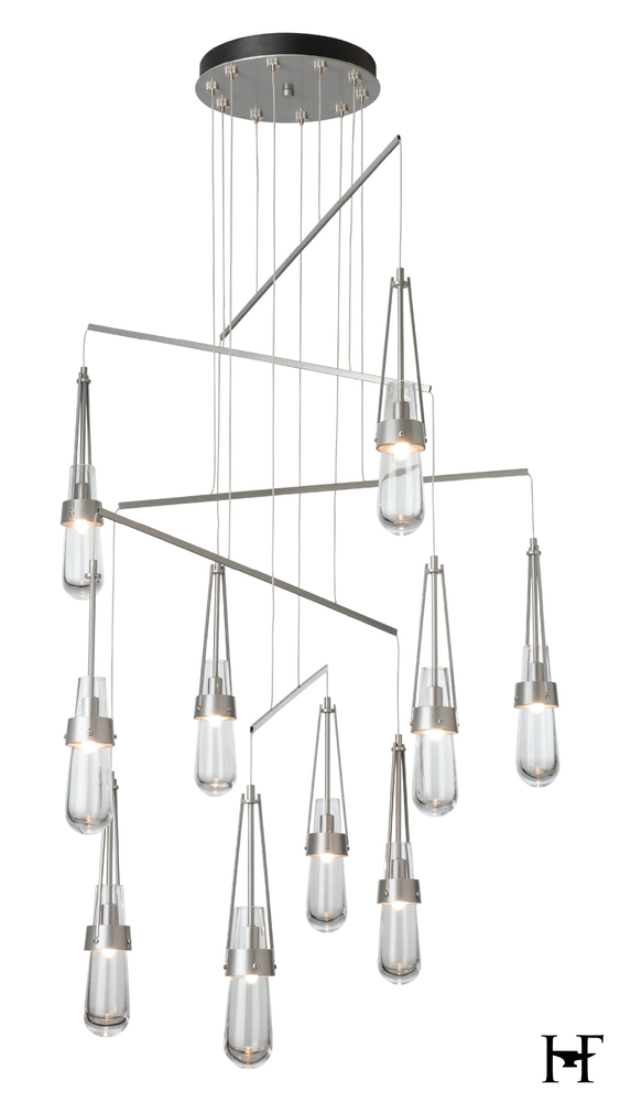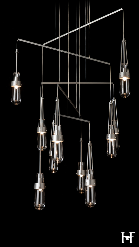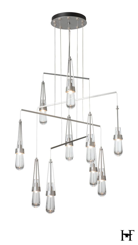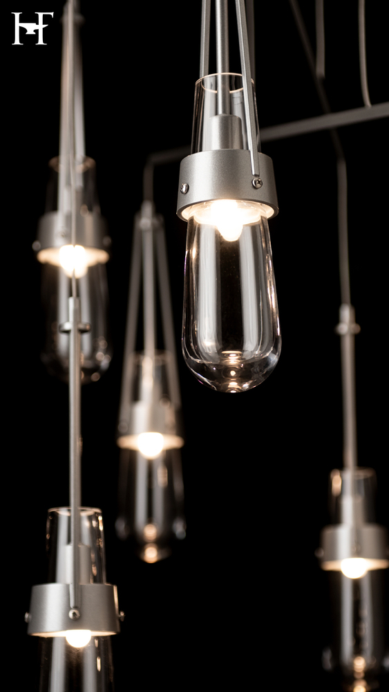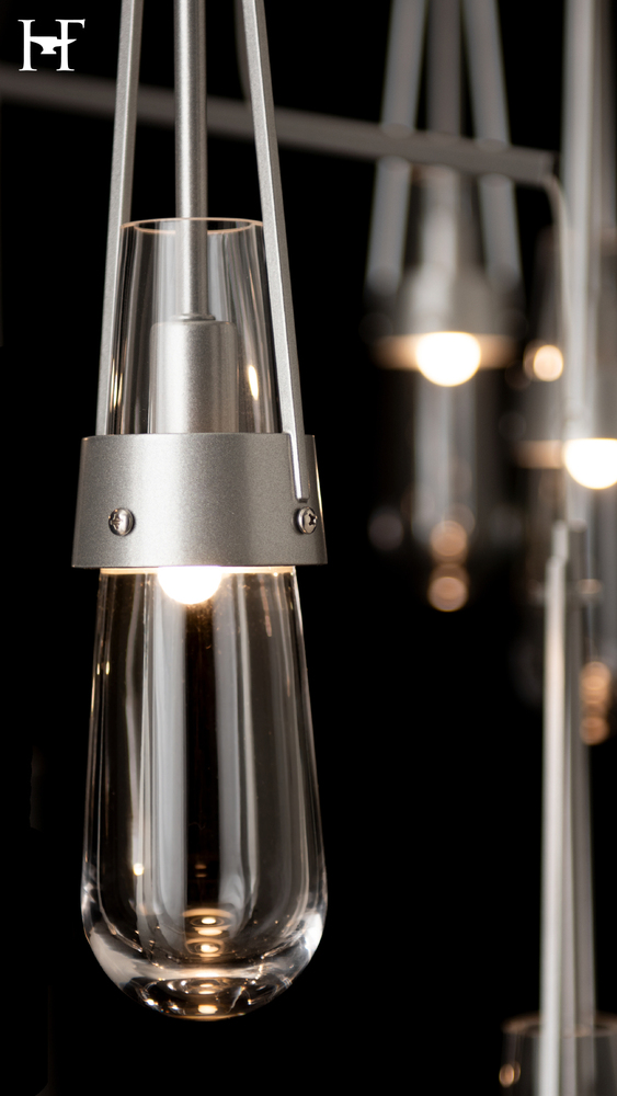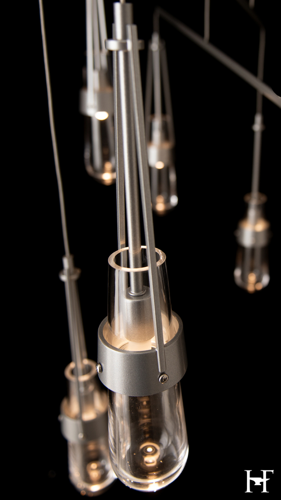 Love our Link Pendant but don't have the ceiling available to accommodate a larger canopy? Looking for the Link to occupy a larger area? Here is the solution. A mobile version, minimizing the canopy while providing a wider expanse gives the Link breadth with delicate metal tubes that guide the cables in a highly-adjustable balance of light. Ten thick, clear glass vessels are the trademark of this Link pendant.