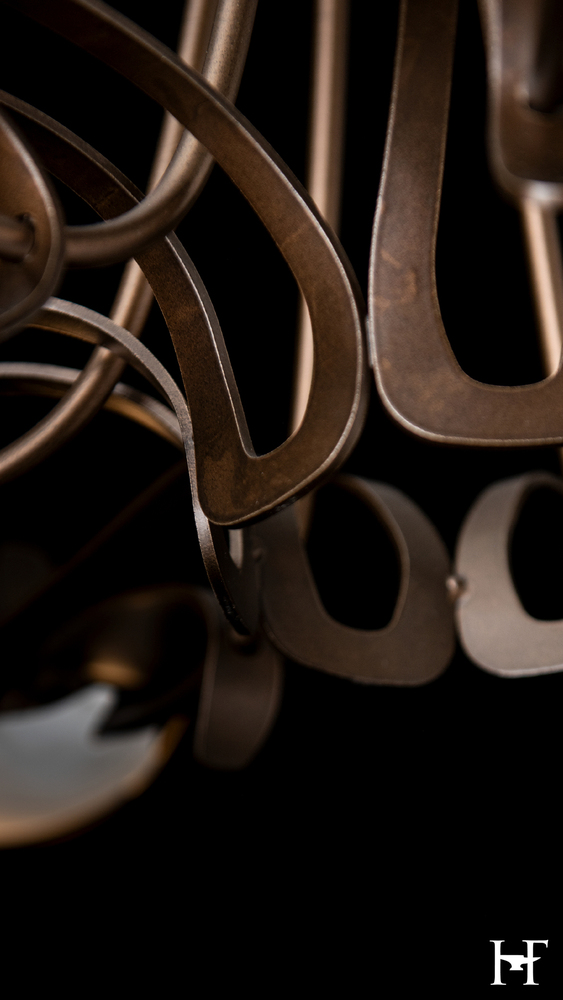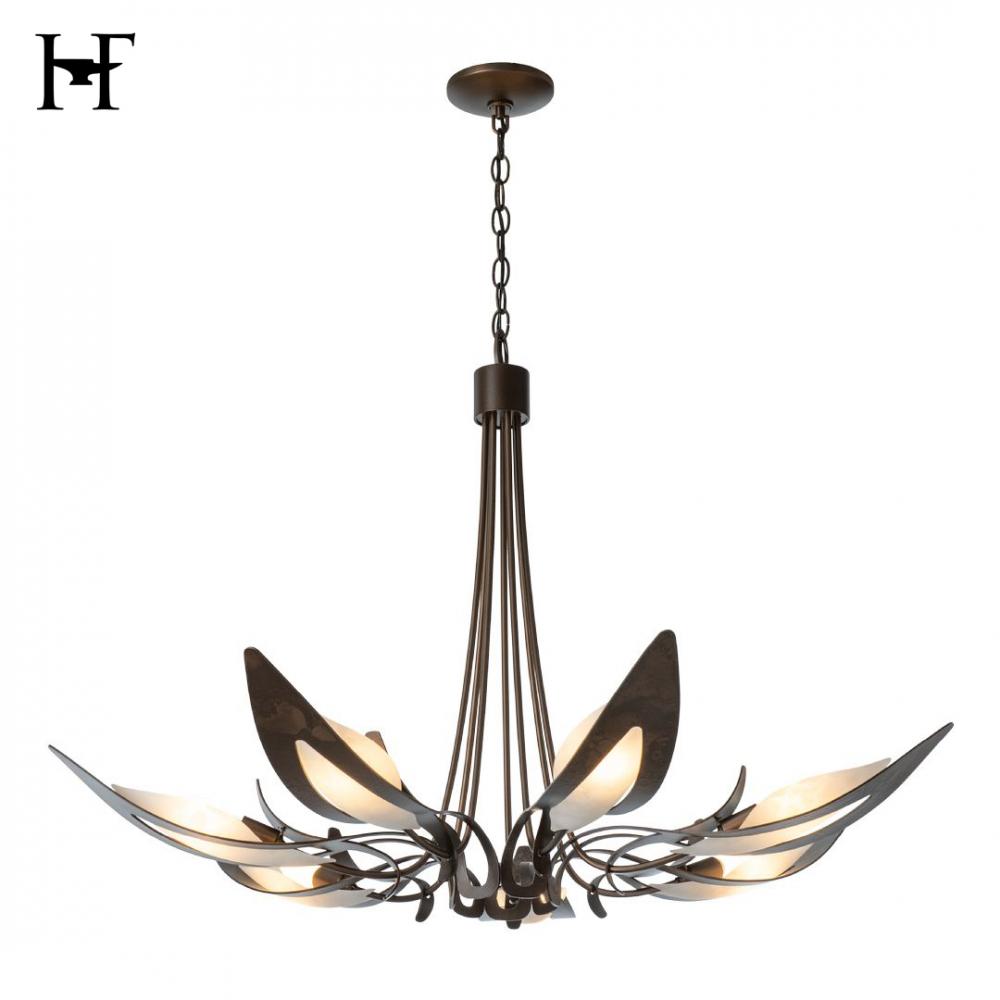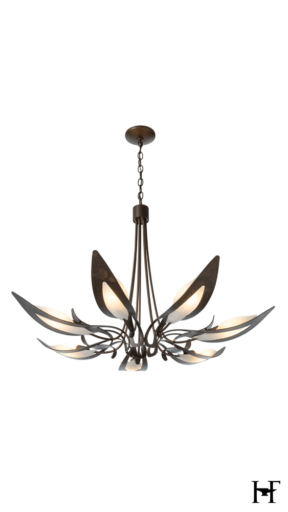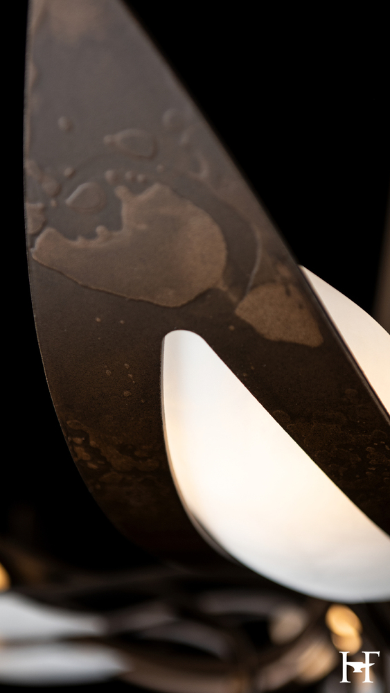Skilled Vermont artisans hand-forge and shape this beautiful lighting fixture, reminiscent of a parasol form. The forged metal texture comes through in each detail. Handmade slumped art glass is nested into each of these seven arms. Parasol designer Jason Hancock recommends using a "milky" candelabra bulb for the perfect effect.