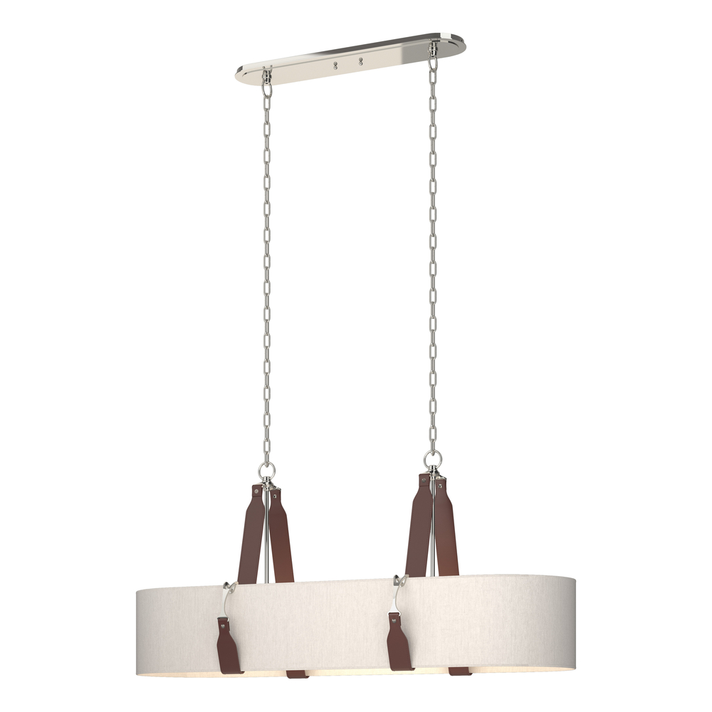 A large pendant, perfect over a dining table, as well as lounge or entertainment space, the Saratoga Oval Pendant features leather strapping with Antique Brass or Polished Nickel fittings, as with all fixtures in the Saratoga Collection. This Oval Pendant features a double-faced shade, as beautiful inside as out. Chain-hung at two points to its canopy, this pendant makes a statement.