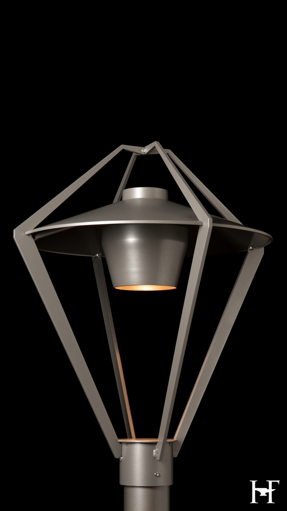Enclosed in a stunning metal exoskeleton for a minimalist contemporary take on a classic lantern design, this Dark Sky Friendly post light offers a sophisticated welcome to visitors. Its airy, open "cage" contains a short metal cylinder from which the light emanates. By focusing the light downward, light pollution is reduced and the effective lighting helps to increase path safety.
