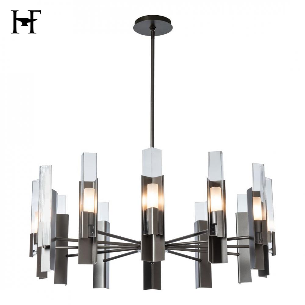 Designer Ori Goldberg expanded upon a jewelry design of his to create the Summit 12-Light Pendant. Three right angles—metal/glass/metal—are positioned in ways that up the ante and bridges traditional to contemporary style with its clean, geometric lines.