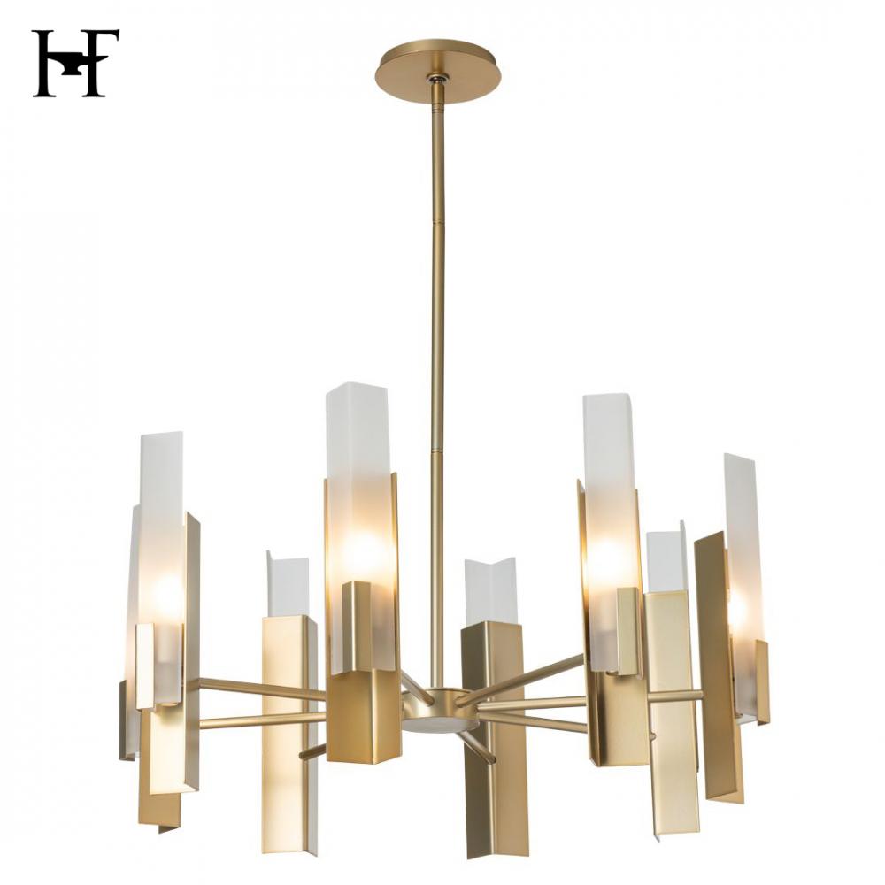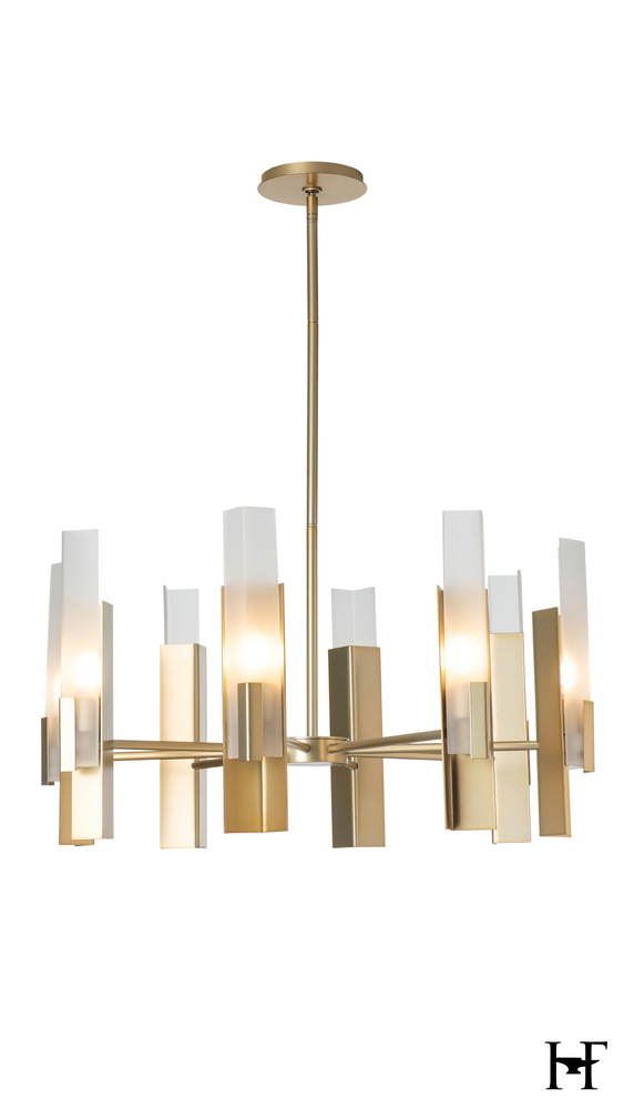 Inspired by earrings made by our jeweler-turned-lighting designer Ori Goldberg with two squares completing one another, the Summit 8-Light Pendant takes a traditional configuration with all arms radiating from the center, and gives it a contemporary turn with glass and steel coming together at 90º angles. A very geometric aesthetic, the Summit, in fact, features 3 right angled elements: the steel backdrop, the clear glass and the steel piece that secures the glass.