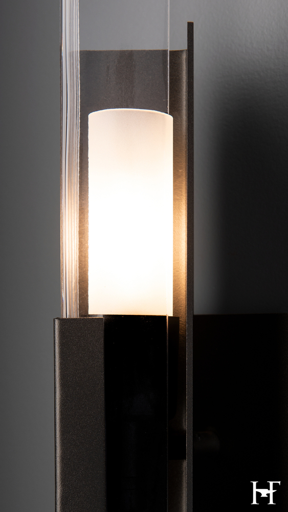 A classic design with a contemporary feel, two right angles that embrace to shield the light within, the Summit Sconce features steel that is bent to 90º that holds a glass element that is shaped to the same angle. A frosted cylinder of light is centered between the two, creating a stunning effect.