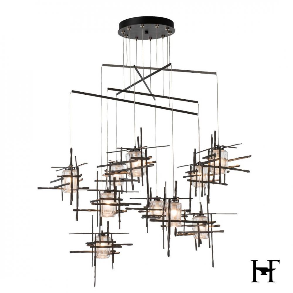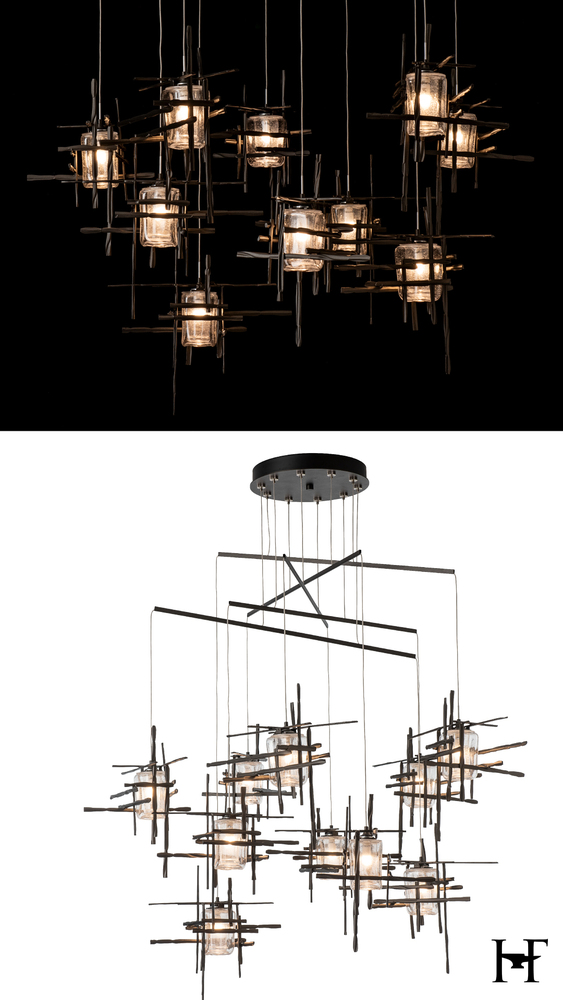 The thick, seeded glass of the Tura is on full display on the Tura's mobile platform. With a unique balance of art and light, the Mobile features delicate metal tubes that guide the cables for a highly-adjustable design, allowing for an expansive reach, all while minimizing the canopy.