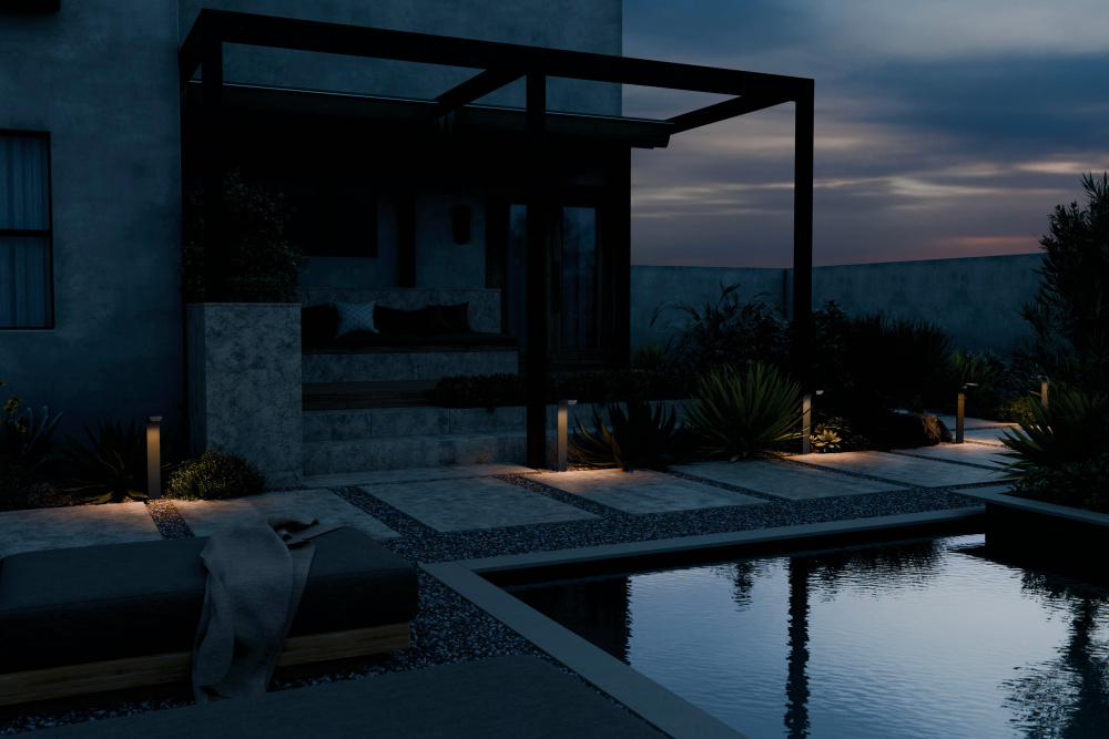 Its contemporary design blends seamlessly with nature while spotlighting the surrounding exterior style