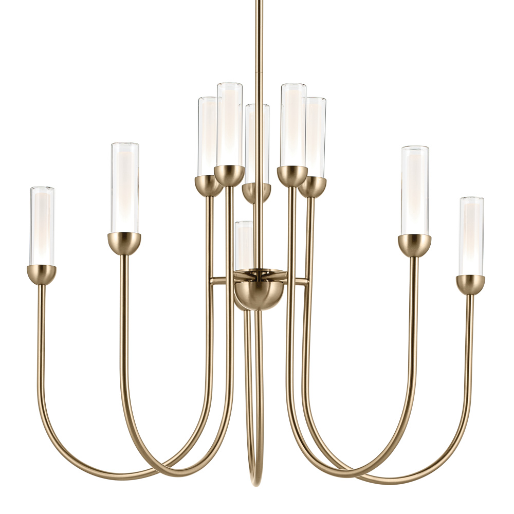 On-trend yet timeless, the Moraine LED chandelier is true elegance. Swooping concentric curves update the traditional chandelier look. Each candle holder cups the integrated LED light source with layered glass. Clear outer glass pairs with an etched interior to give the illusion of ambient candles that light up any space.