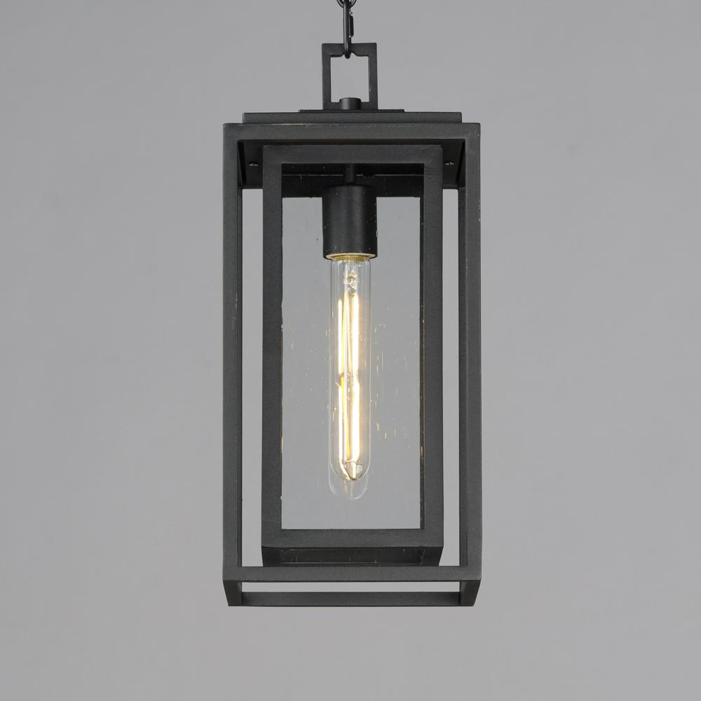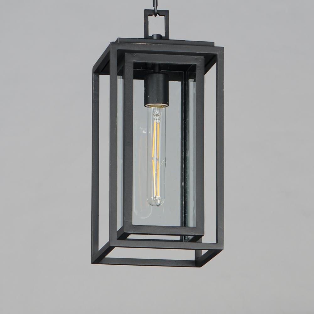 A dual framed structure creates dimension on these outdoor lighting fixtures that is both contemporary and transitional. The construction consists of two frames of square tubing and squared components. The inner frame's Clear Seedy glass reduces gla
