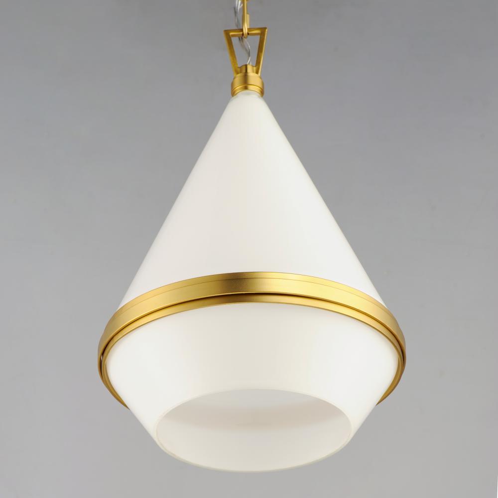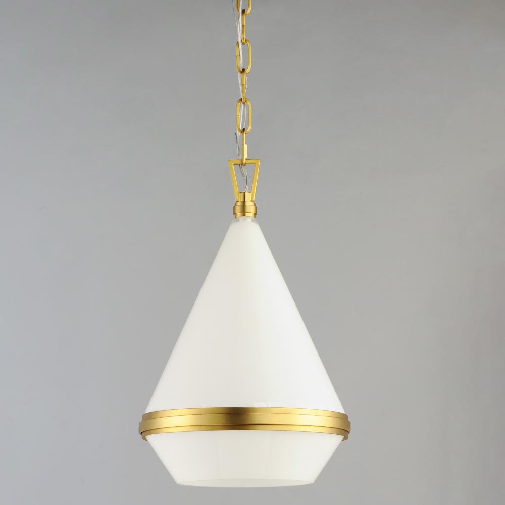 A glossy White glass shade, conical in form, is combined with sharp-lined bands of metal finished in your choice of Polished Nickel or Satin Brass to create a pyramid of softly diffused light. Squared off trapezoidal chain loops connect to squared chain li