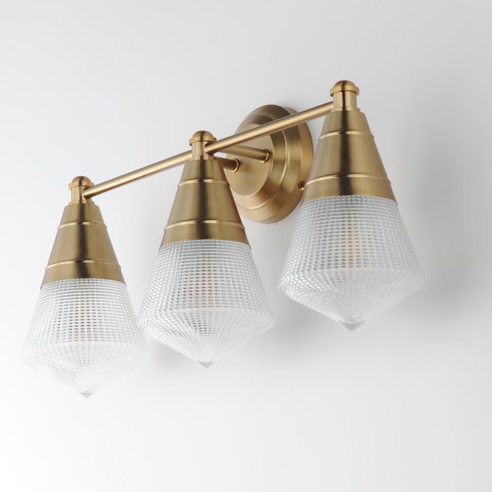 A prismatic diffusion of light is housed within pressed cone glass shades. Choose from pendants with tapered metal halves that conceal the light source or glass shades that are supported by a metal ring. Coordinating bath vanity lights complete the collect