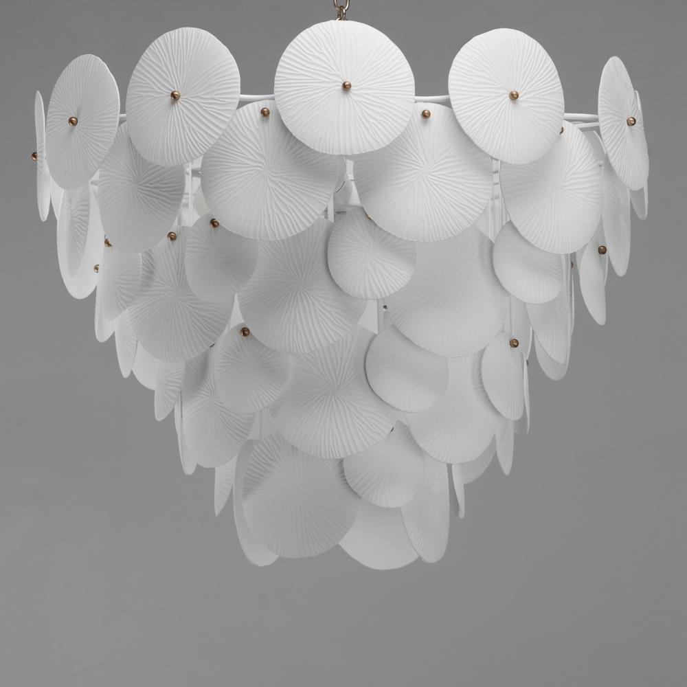 Featuring suspended tiers of textured, translucent ceramic panels, this design softly diffuses light across an undulating Matte White frame. Tiny brass knobs secure the veined ceramic panels, allowing the light to highlight their intricate texture and crea
