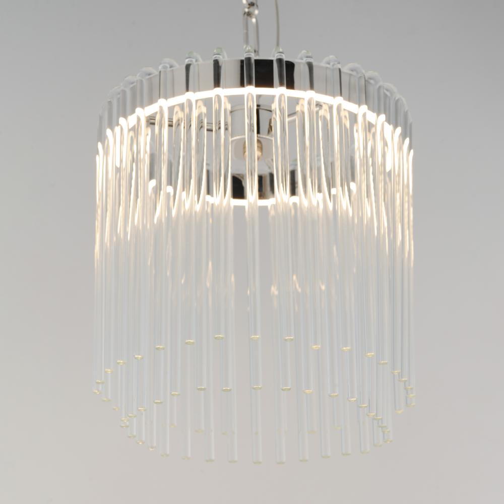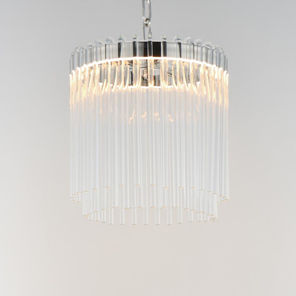 Clear glass rods elegantly curve to drape over a metal frame, encasing an integrated LED light source within. These ornamental glass rods form a luminous curtain, softly illuminated by the LEDs. The LED light source features an adjustable color temperature