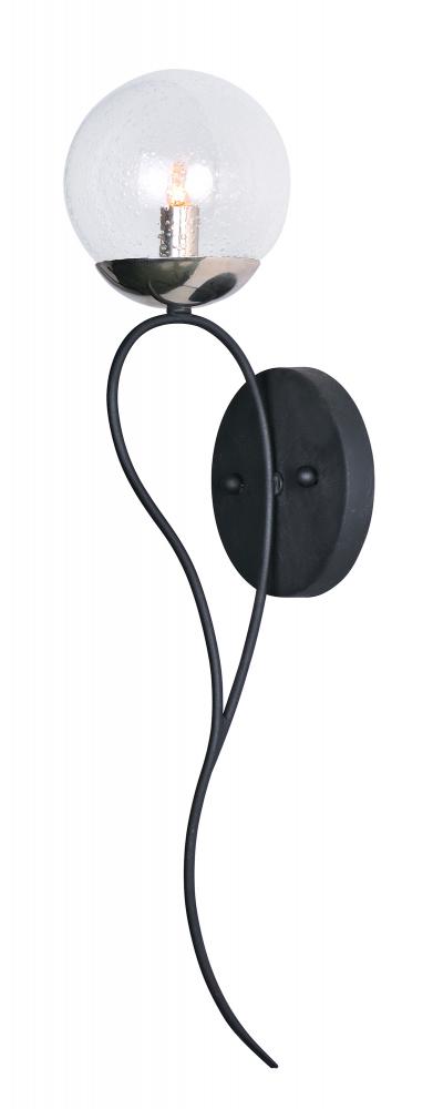 Small dimension metal tubing is artfully bent to loop back to the origin that creates an unique and delicate arm. Supported by this graceful arm is a round bubble glass shade. Available in your choice of Textured Black with Polished Nickel accents a