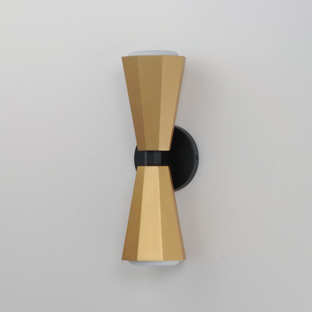 The Rizzo collection exudes stylish flair and spirited design, combining faceted metal shades in Natural Aged Brass with striking Matte Black accents. A flat-bottomed Satin White glass shade protrudes gracefully from the base of each metal shade, deliverin