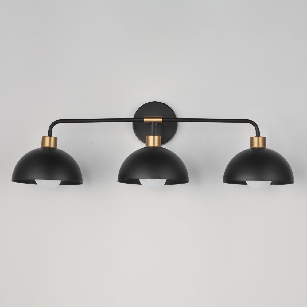 Dome shaped shades in Matte Black contrast Natural Aged Brass accents. Available in flush mount, bath vanity, and swing arm wall sconce configurations. This collection delivers an approachable, modern design that pairs well with transitional design aesthet