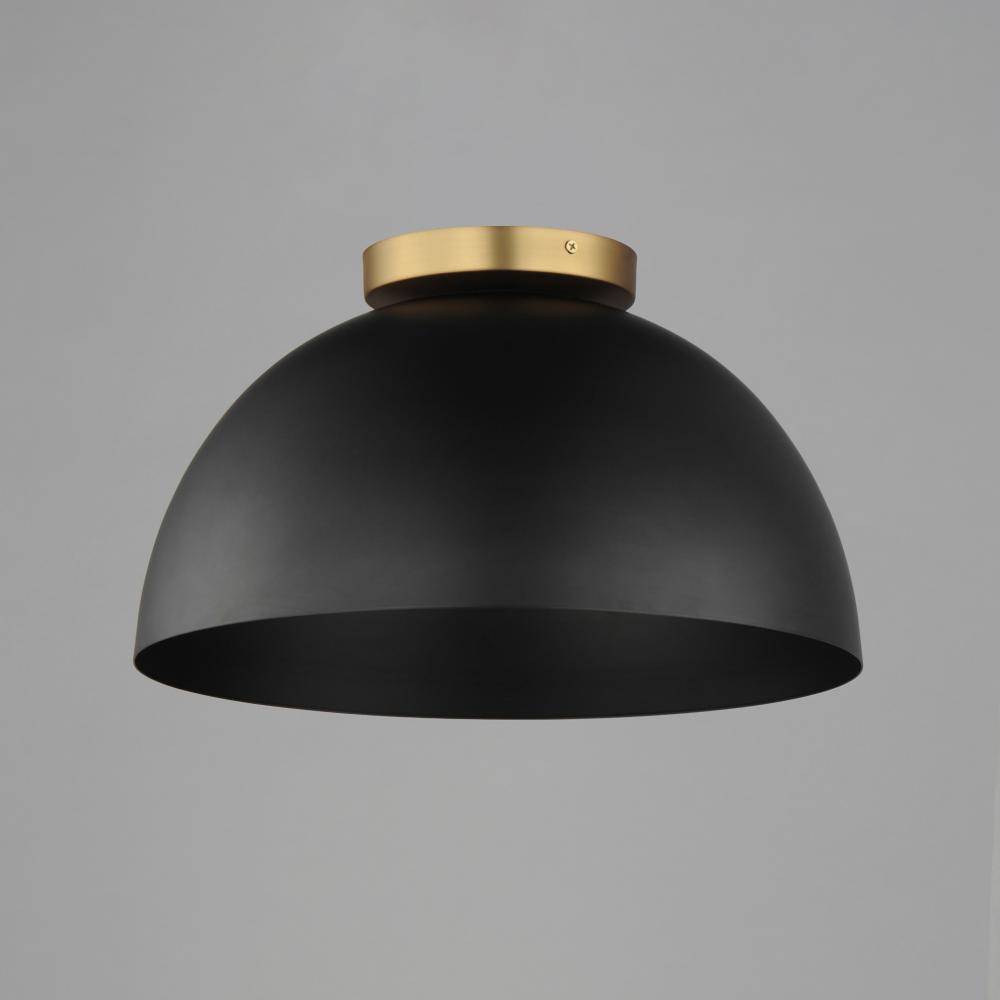 Dome shaped shades in Matte Black contrast Natural Aged Brass accents. Available in flush mount, bath vanity, and swing arm wall sconce configurations. This collection delivers an approachable, modern design that pairs well with transitional design aesthet