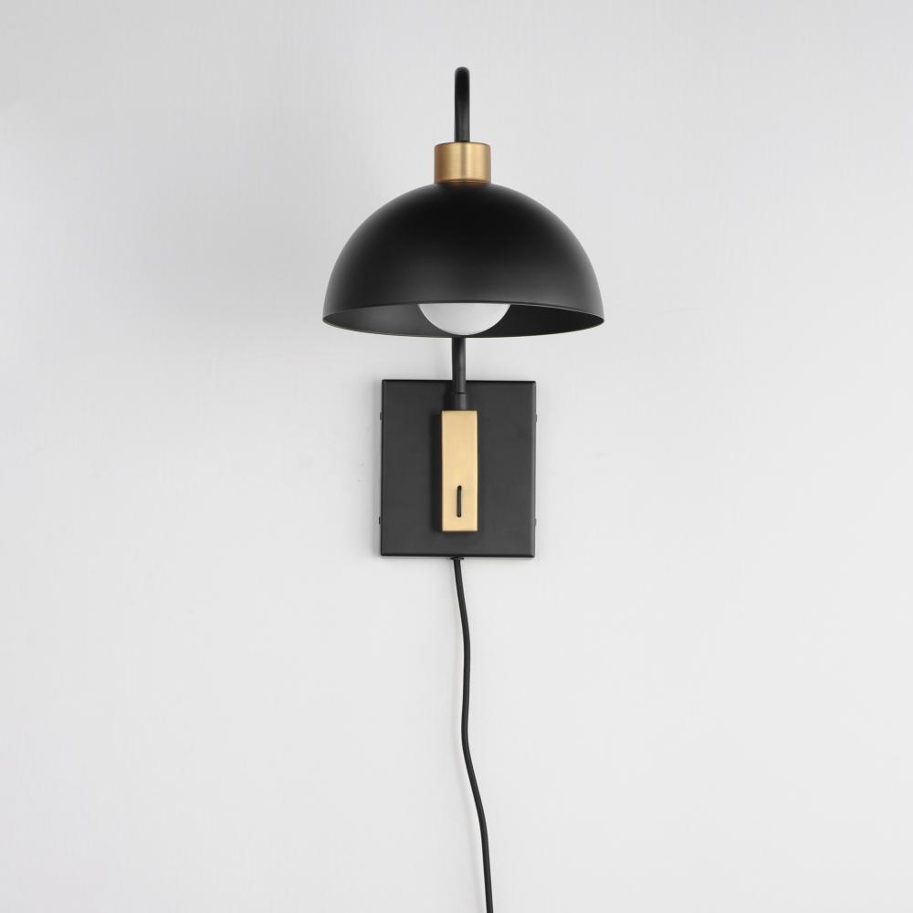 Dome shaped shades in Matte Black contrast Natural Aged Brass accents. Available in flush mount, bath vanity, and swing arm wall sconce configurations. This collection delivers an approachable, modern design that pairs well with transitional design aesthet
