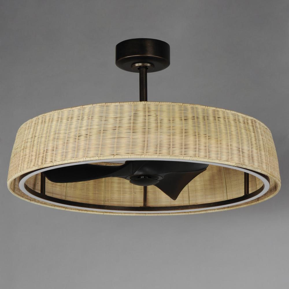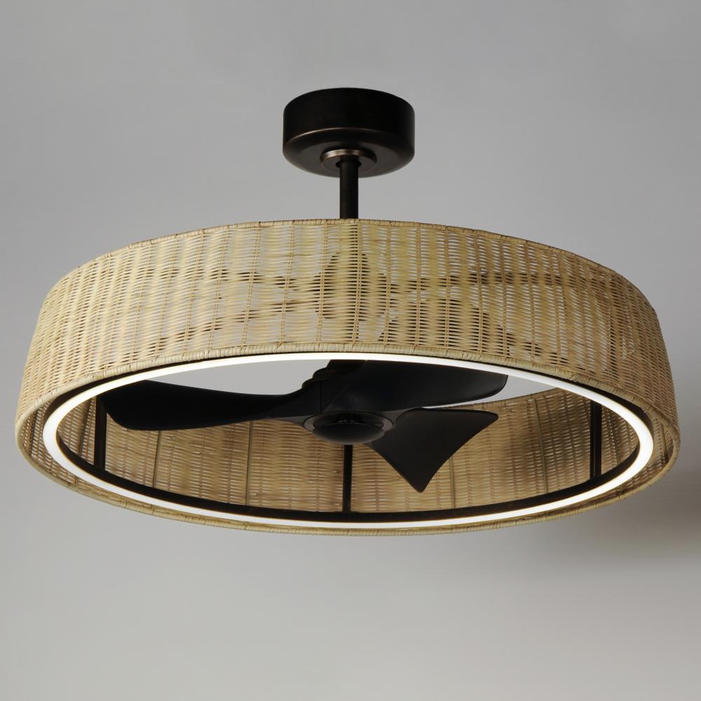 Hand-woven rattan wicker in a natural or darkened finish are shaped into a sloping drum shade with an internal fan and LED light source within them. The contrasting Dark Bronze finish of the metalwork encases an LED ring toward the bottom edge of the shade