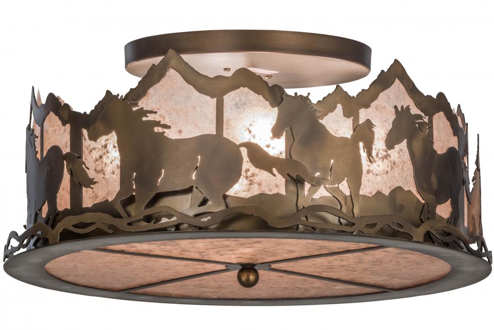 Wild Horses gallop across the mountainside as the warm morning sun rises in the background. Beautiful ambient lighting is projected through a stunning Silver Mica lens and bottom diffuser while the hardware is featured in an Antique Copper finish. The fixture is custom crafted in the Meyda facility; at the foothills of New York's Adirondack Mountains.