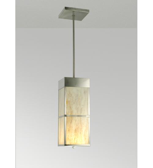 This pendant fixture puts a contemporary twist to Asian lighting. The Satin Steel finished shade has Travertine and Statuario Idalight diffusers that provide soft; warm illumination. This fixture is made in the U.S.A. by Meyda artisans. Custom styles; sizes and colors are available; as well as dimmable energy efficient lamping options such as LED. The pendant is UL and cUL listed for damp and dry locations.