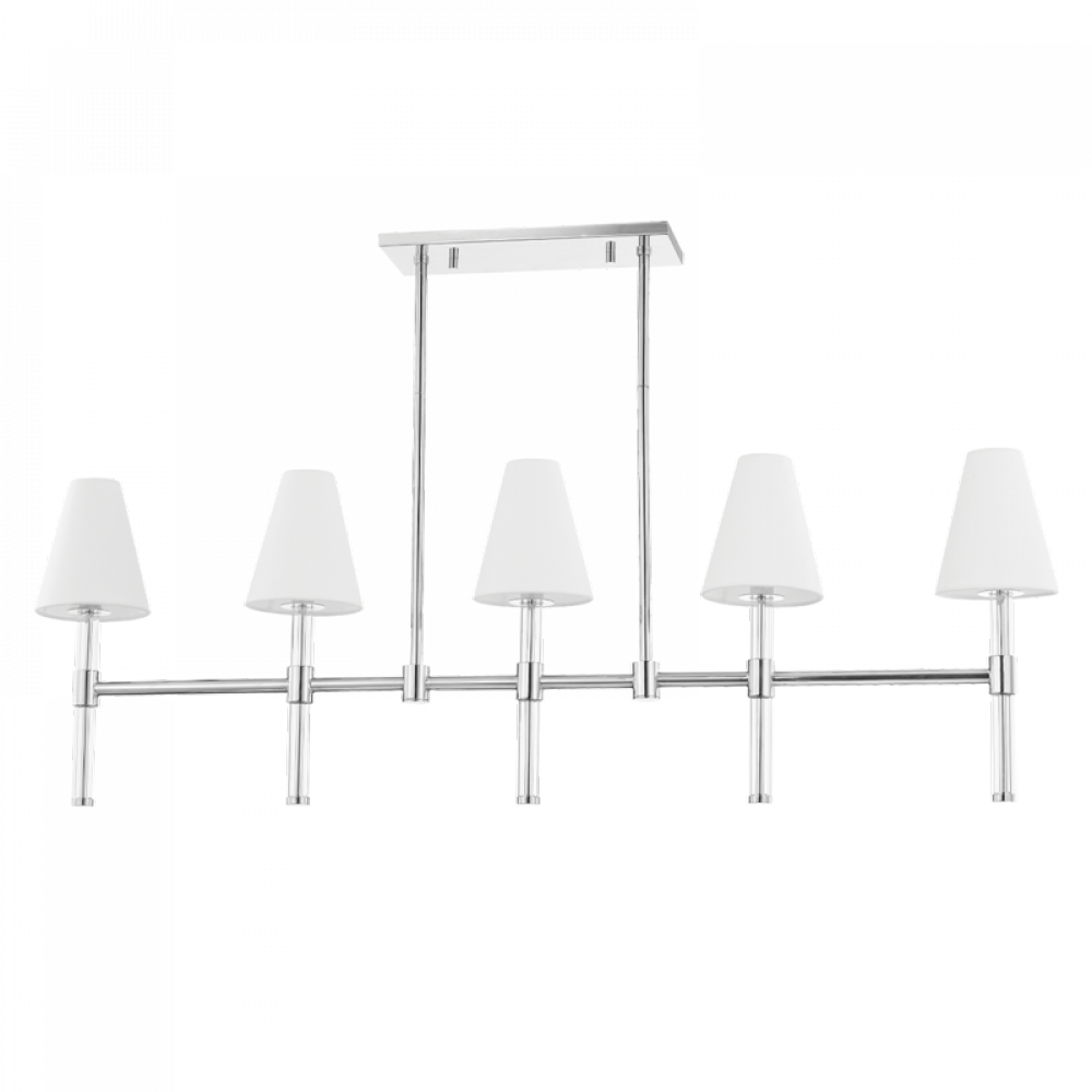 A beautiful blend of acrylic, metal and linen, Janelle gives off a vintage vibe with details that feel fresh. Tapered white linen shades are suspended on long, linear sticks of acrylic that allow the metal details inside to show through. With linear, chandelier and sconce options in aged brass or polished nickel, this updated retro design is sure to find a place in your space.