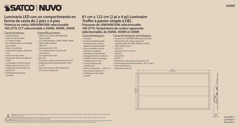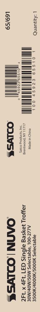 SATCO NUVO's 65-691 is a foot by four foot single basket troffer which features selectable wattage and color temperature. The troffer features an acrylic linear prismatic lens which allows for broad, even light distribution. The driver allows for flick